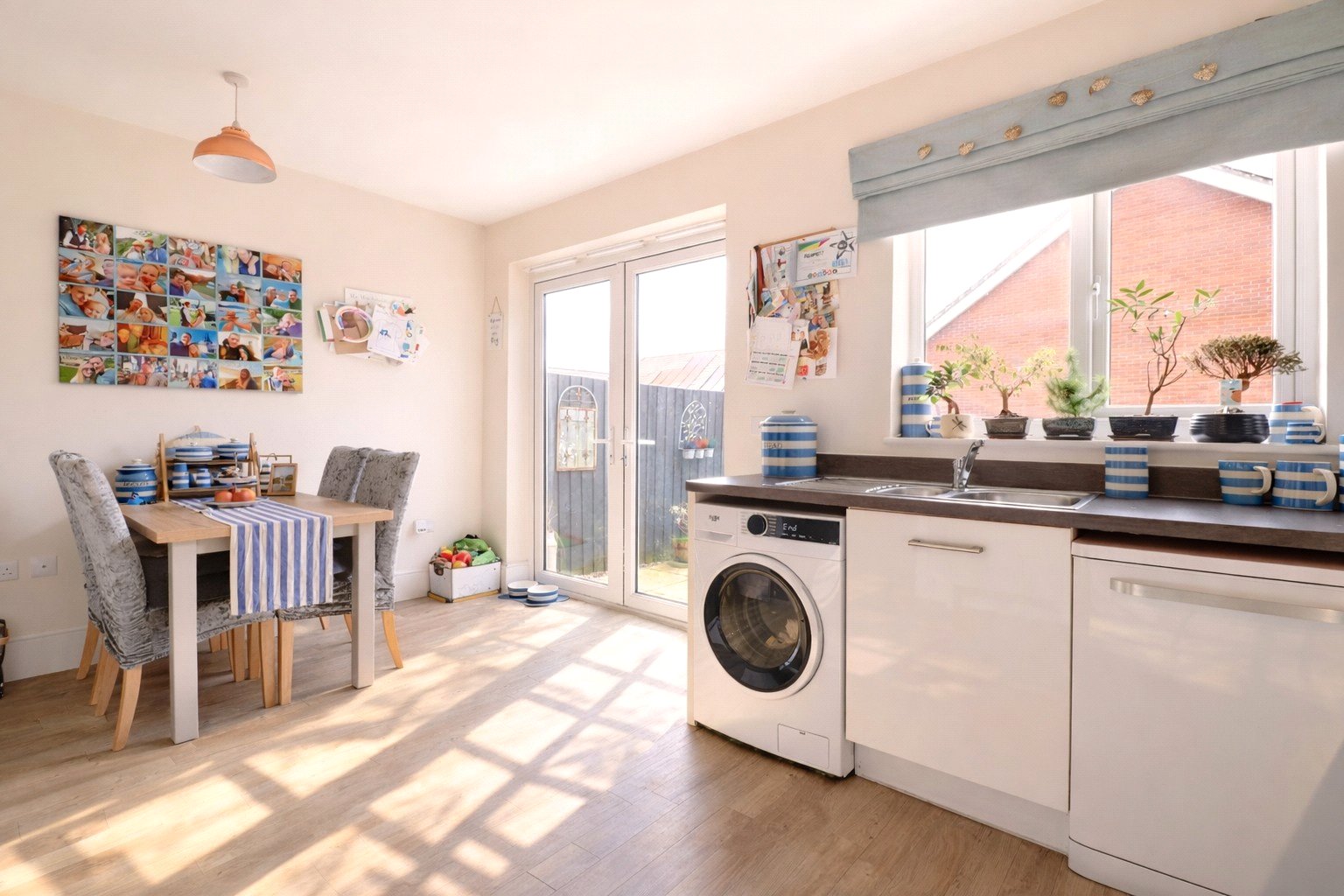 To the rear of the property lies the modern fitted kitchen/dining room, undoubtedly the heart of the home. Thoughtfully designed with a range of units providing ample cupboard and worktop space, the kitchen benefits from an integrated double oven, four-ring gas hob, integrated fridge freezer, and additional appliance space. There is plenty of room for a family dining table, making it ideal for everyday living and entertaining alike. Patio doors open directly onto the enclosed rear garden.
