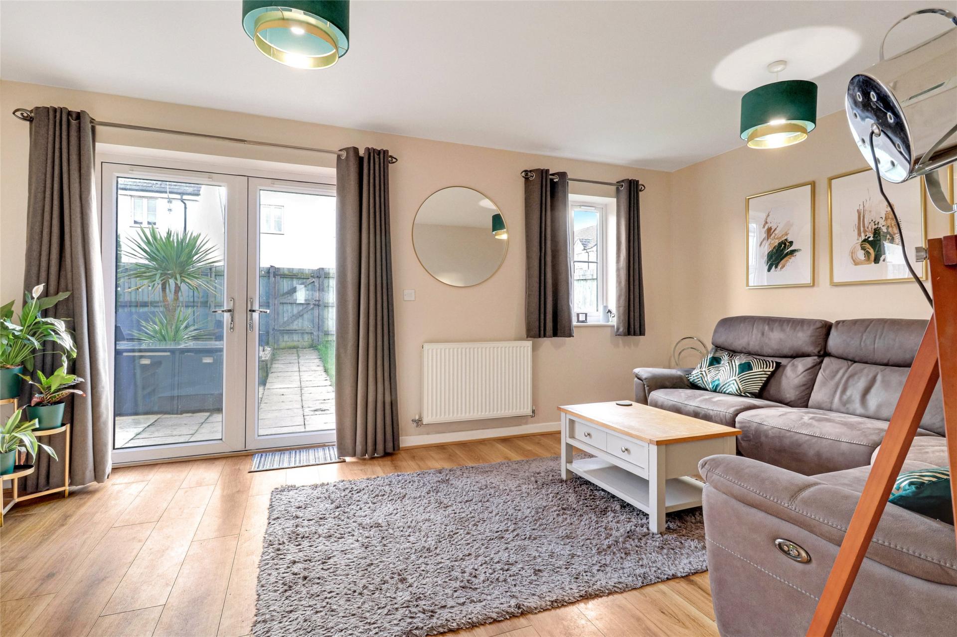 The generously proportioned living room offers ample space for sizeable furniture and French doors to the rear garden.