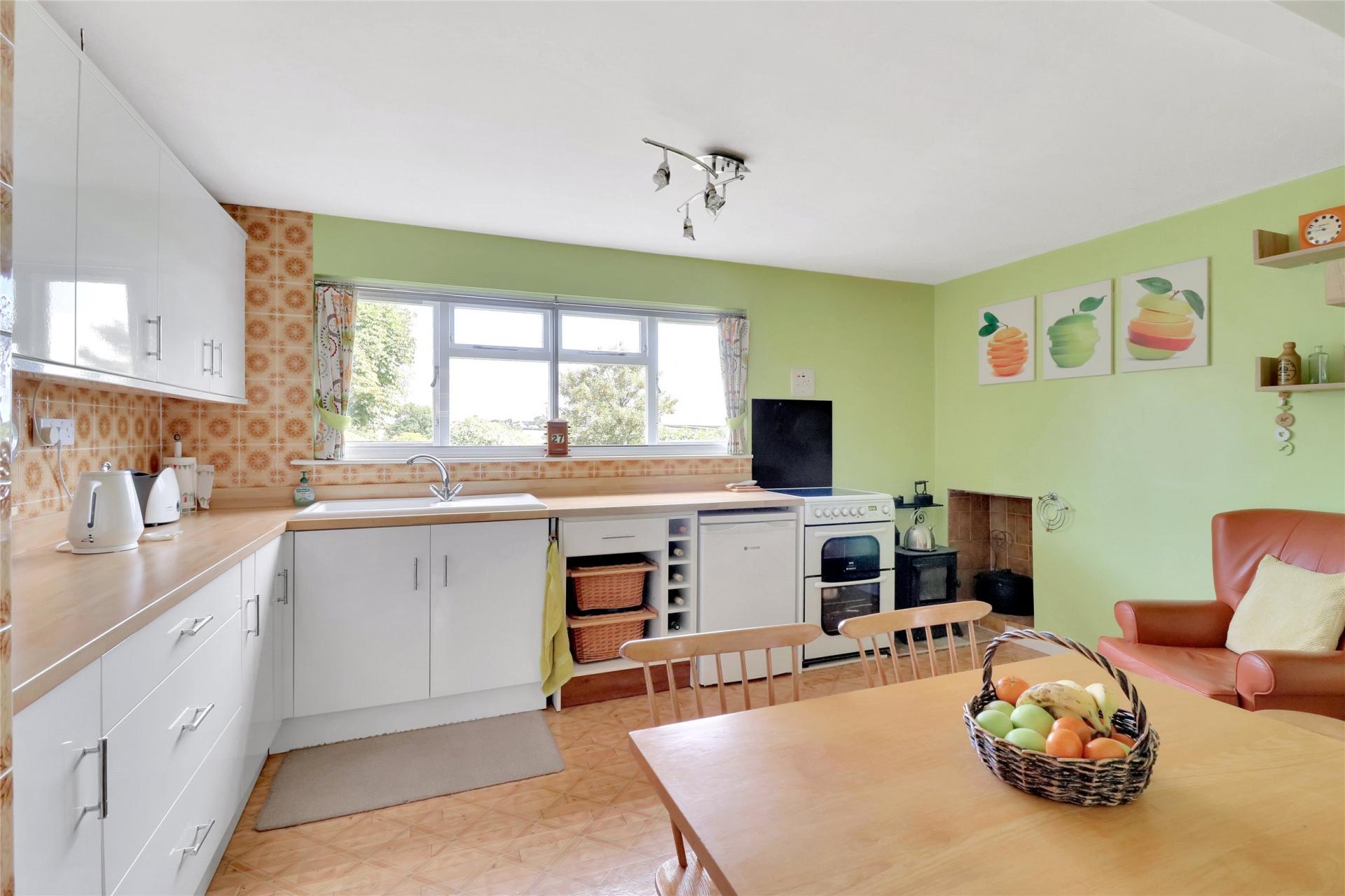 The kitchen/diner also enjoys outlooks over the rear garden. A feature gas fire designed to mimic a traditional log burner adds charm, with the chimney already constructed to accommodate a real log burner if desired. The kitchen itself is fitted with matching wall and base units, a ceramic sink, and plumbing for a dishwasher, while also providing enough space to comfortably seat six around a breakfast table.