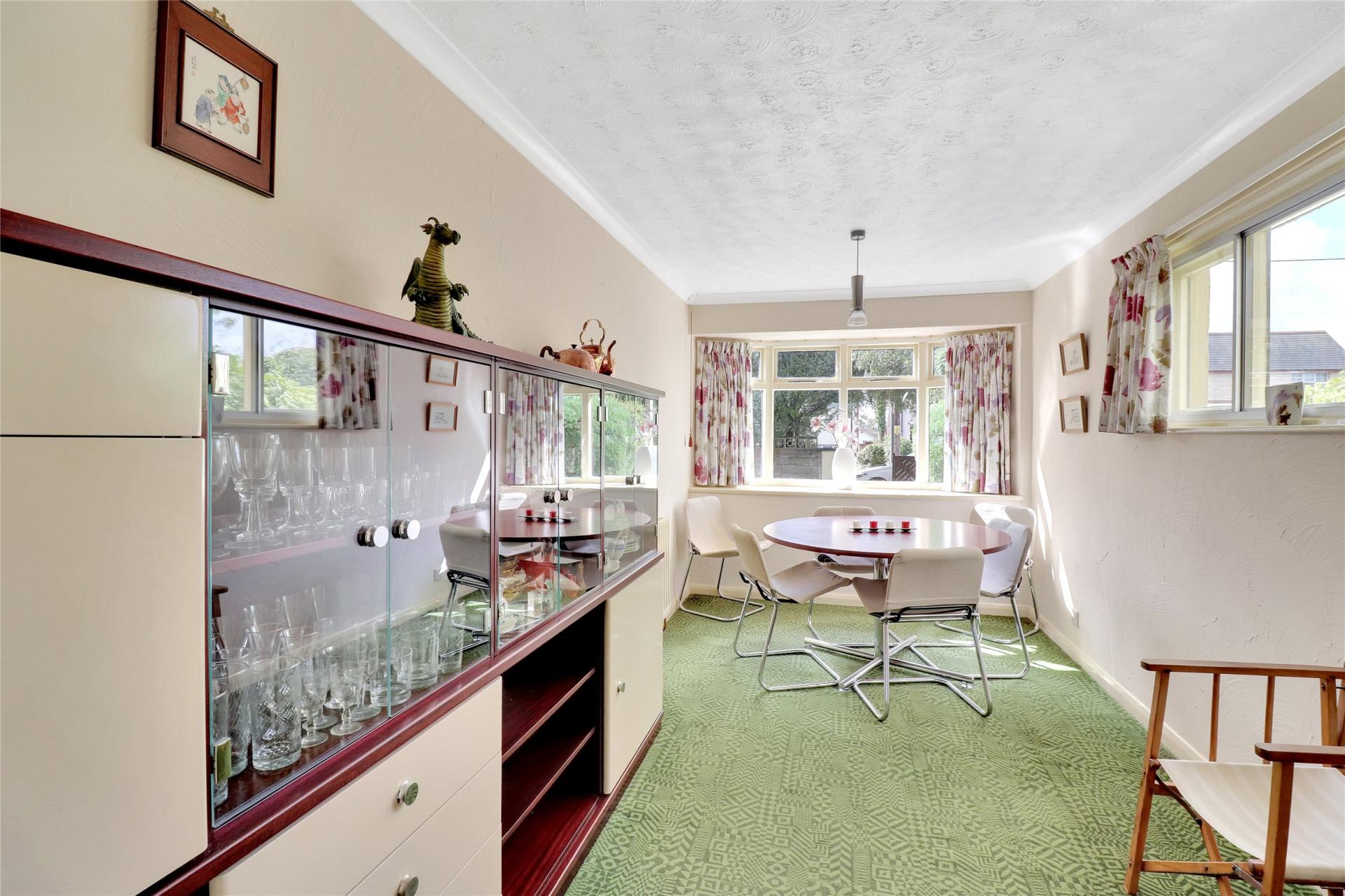 To the front of the property, the formal dining room is accessed via the kitchen and features a delightful bow window that looks out over the enclosed garden. This room provides an ideal setting for entertaining, with ample space to accommodate a large dining table, sideboards, and other freestanding furniture.