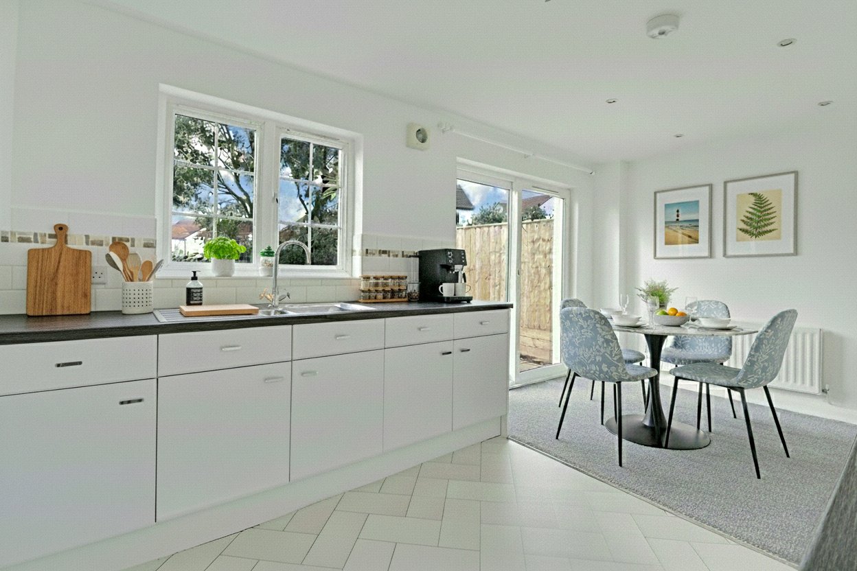 The spacious lounge overlooks the front of the property, creating a bright and welcoming space to relax. To the rear, the open-plan kitchen/dining room is fitted with a range of wall and base units, with ample room for a dining table. Patio doors lead directly out to the enclosed, south-facing garden, making it ideal for indoor-outdoor living. A separate utility room adds practicality, and a newly added ground floor cloakroom completes the ground floor layout.