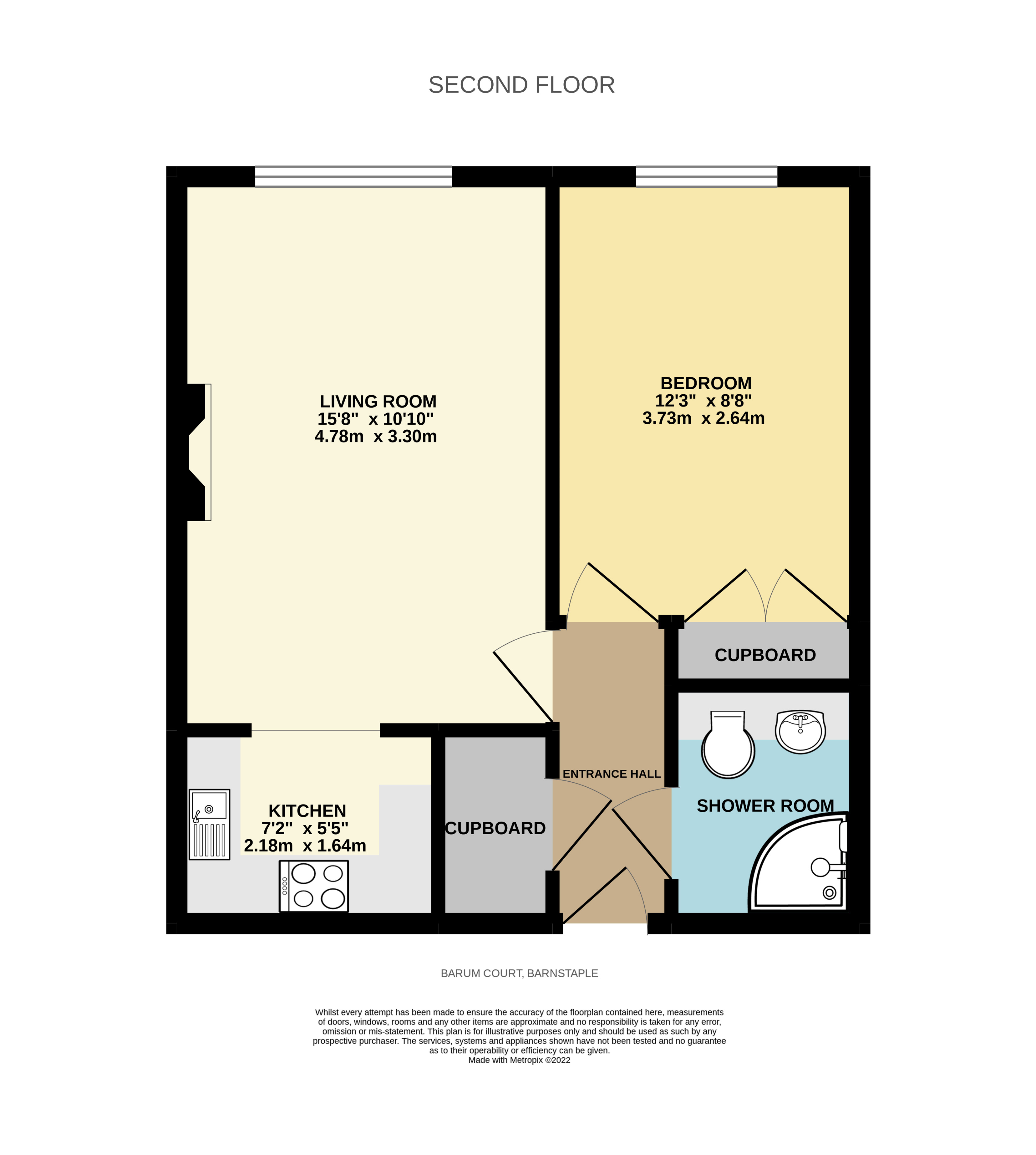 The apartment features a living room, fitted kitchen, one double bedroom with built-in wardrobes, and a shower room.