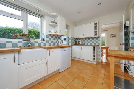 Kitchen - 4.27m x 2.39m (14'0 x 7'10) - Fitted with a generous range of wall, base and drawer units, butcher's block preparation surfaces with under-mounted Belfast style sink, five ring gas hob with chimney hood over, double oven, plumbing for dishwasher, tiled floor, central heating radiator, inset downlighters to the ceiling, UPVC double glazed window to the rear, door returning to the entrance hall and further UPVC door into: