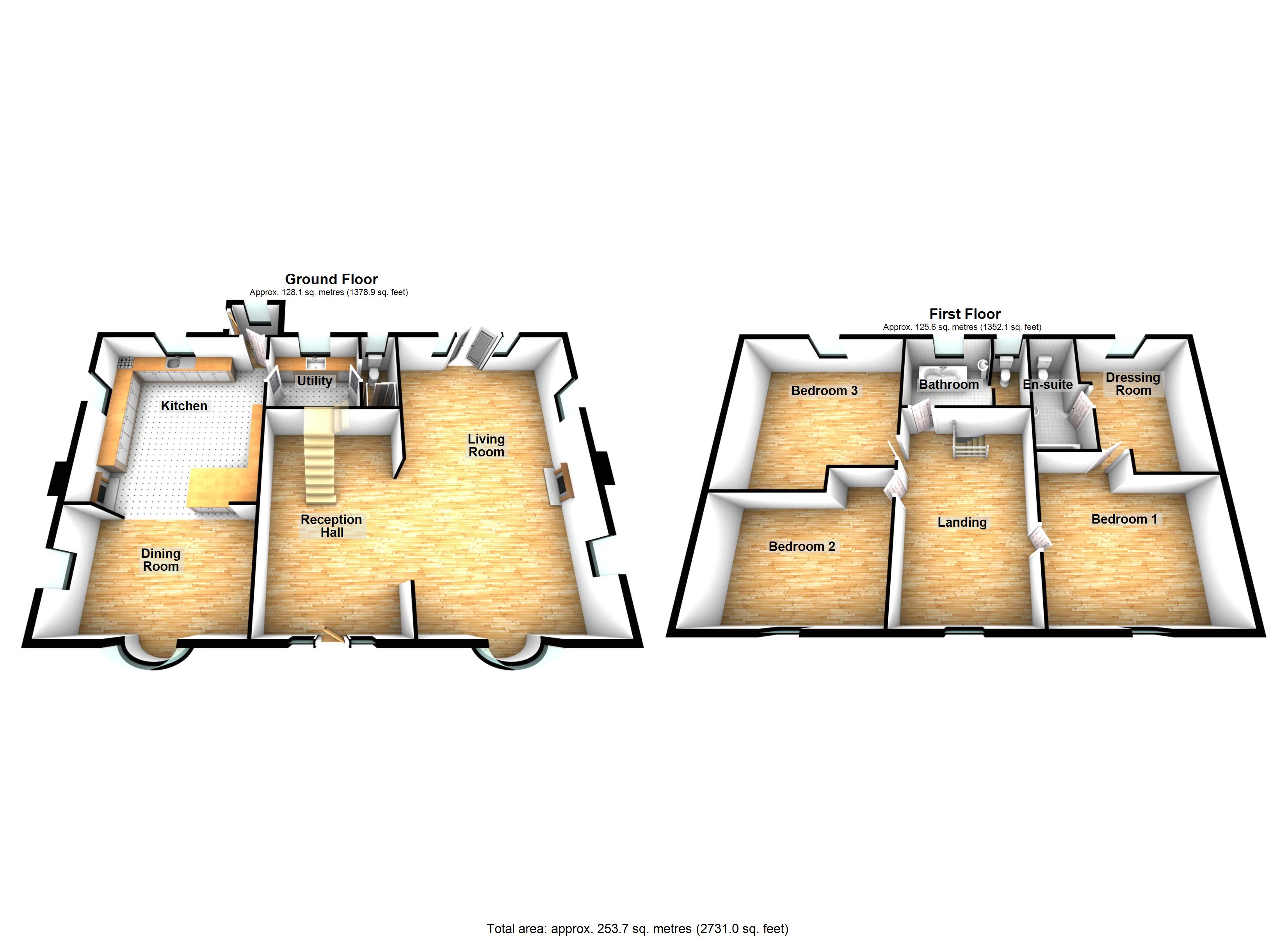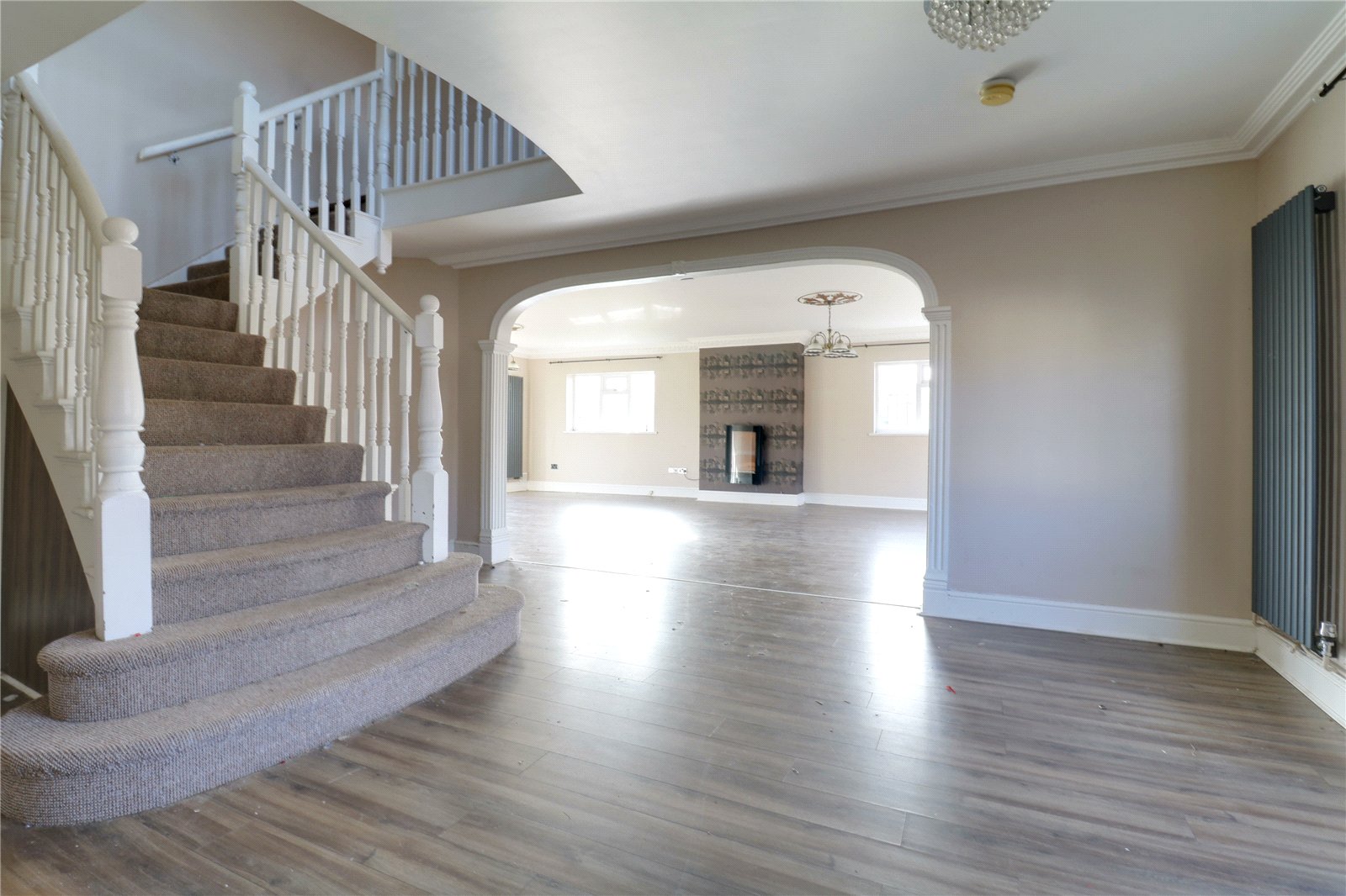 Central Reception Hallway 12'9" x 20'5" (3.89m x 6.22m). With central front uPVC double glazed and leaded entrance door with adjoining side lights, laminate flooring, a feature return staircase leads to the first floor accommodation with open spell balustrading and twin large newel posts, two modern radiators, wall to ceiling coving and a broad opening leads to;