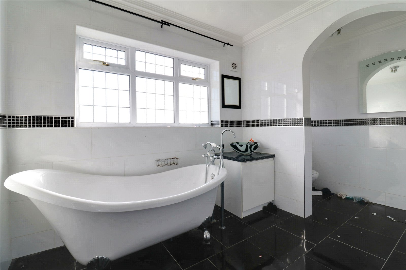 Family Bathroom 8'10" x 7'11" (2.7m x 2.41m). Two rear uPVC double glazed windows with patterned glazing providing a three piece suite comprising a close couple low flush WC, circular wash hand basin, rolled top free standing bath, ceramic tiled flooring, and fully tiled walls, fitted towel rail and built-in white fronted storage cabinets.