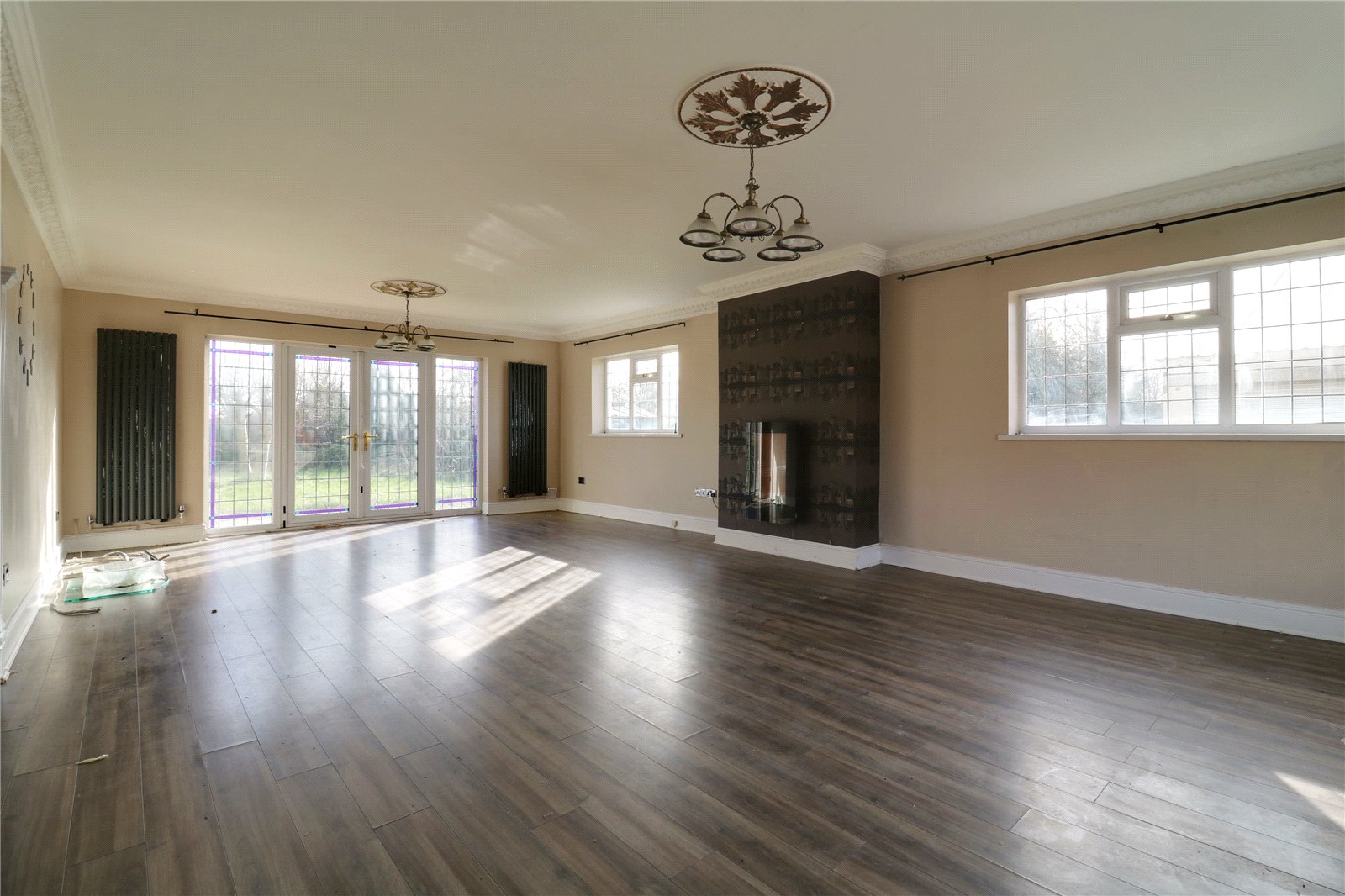 Spacious Main Living Room 16'10" x 28'10" (5.13m x 8.8m). Benefitting from surrounding uPVC double glazed and leaded windows, matching rear French doors leads to the garden with adjoining side lights, four modern style radiators, an electric fire, detailed wall to ceiling coving and twin ceiling roses.