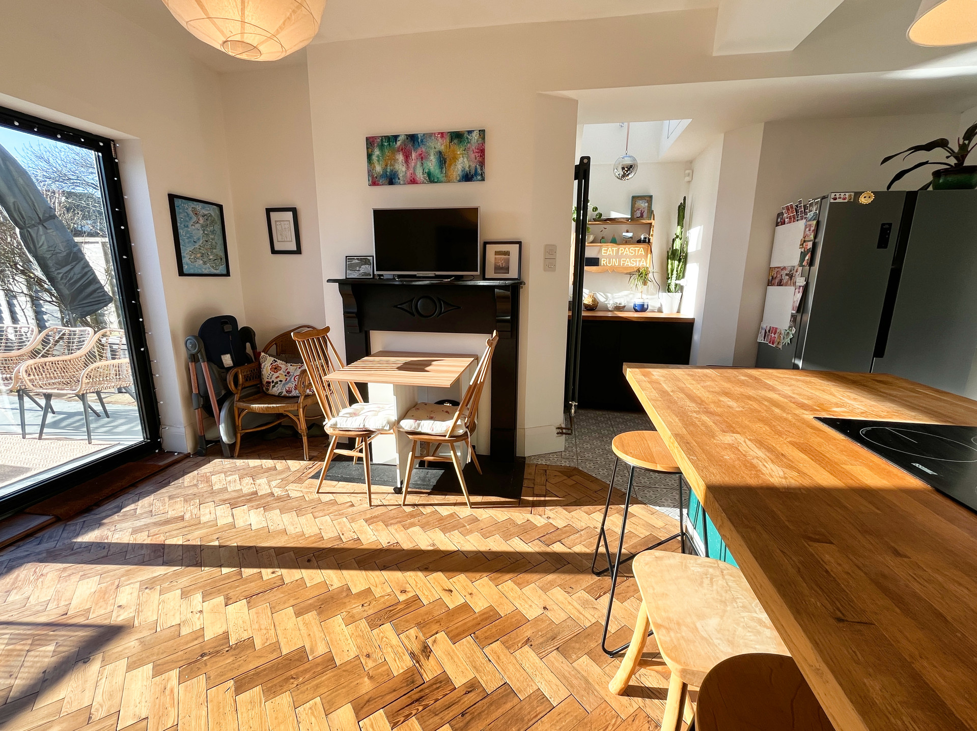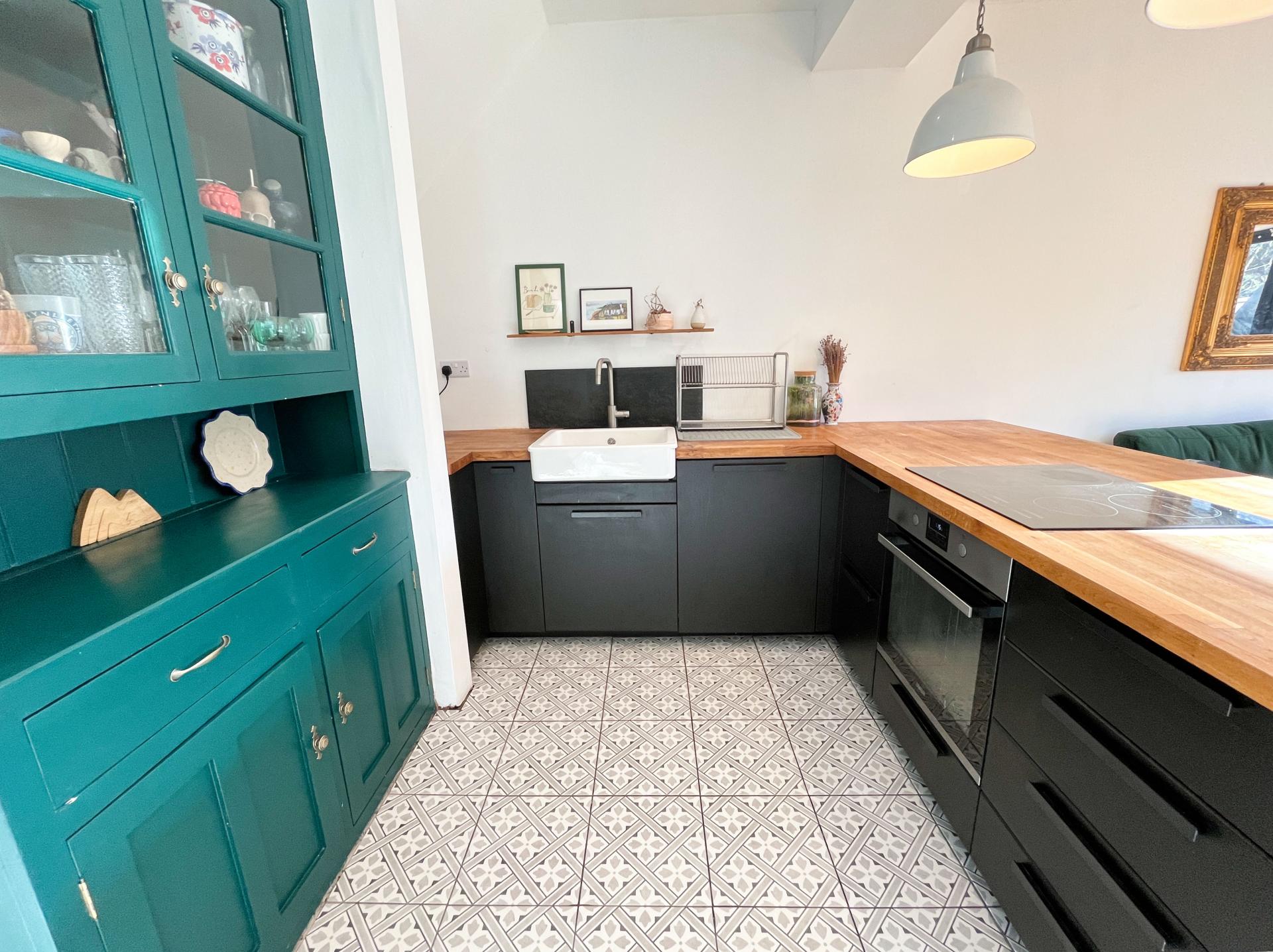 - Contemporary kitchen–diner with Belfast sink and modern appliances.