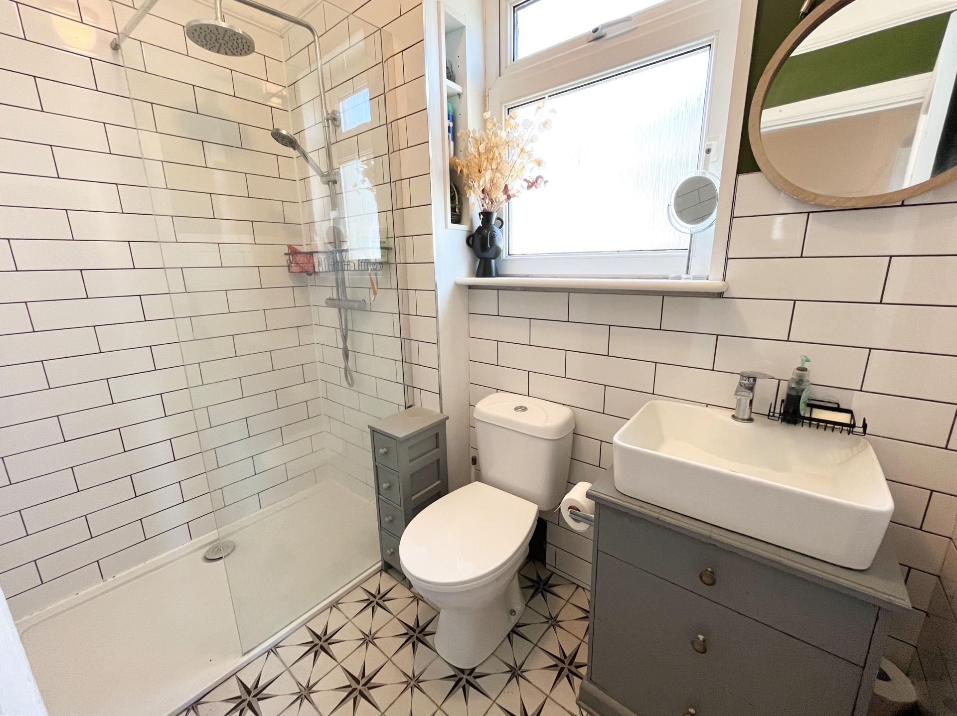 - Stylish main bathroom with double shower and decorative tiling.