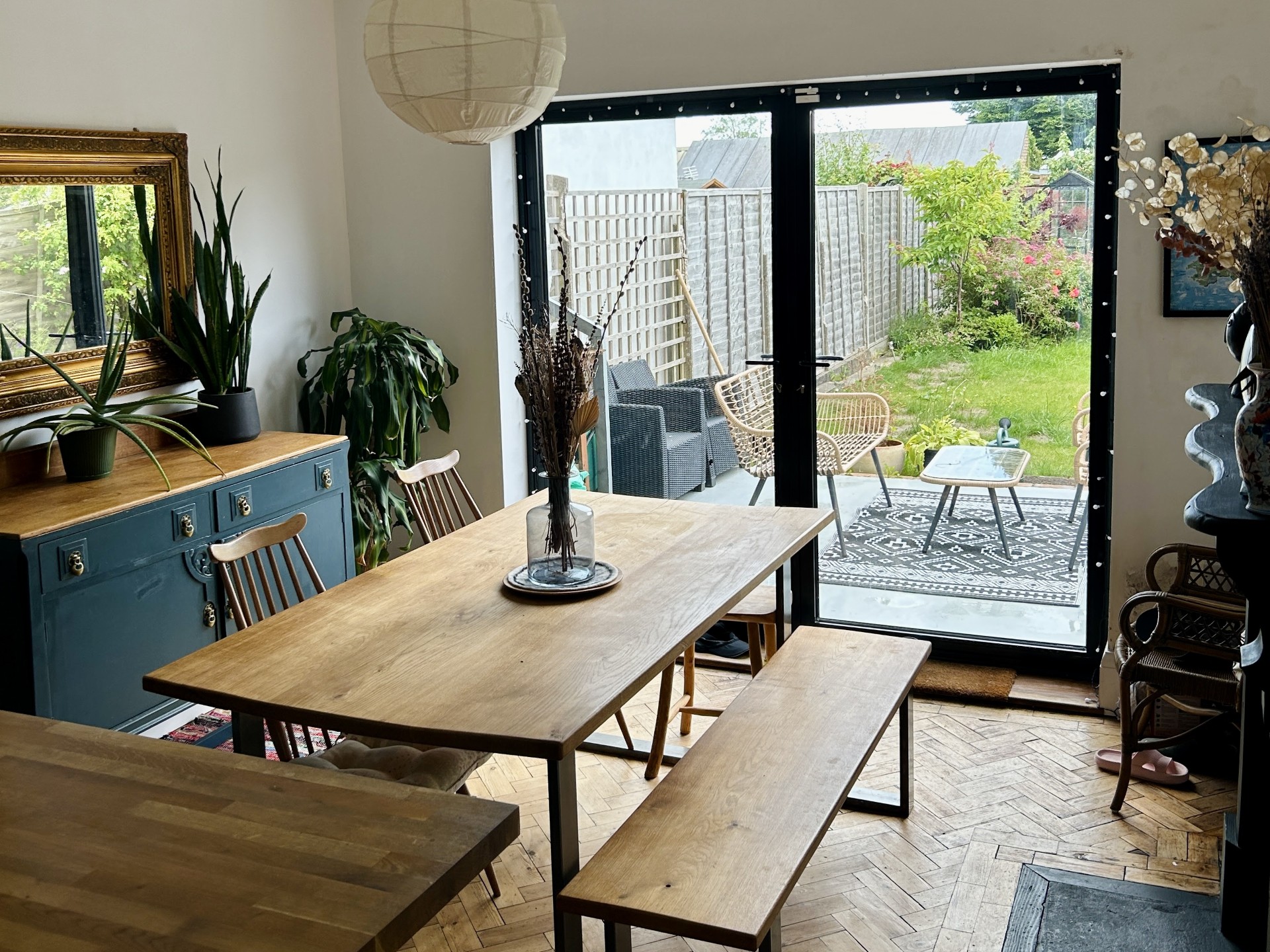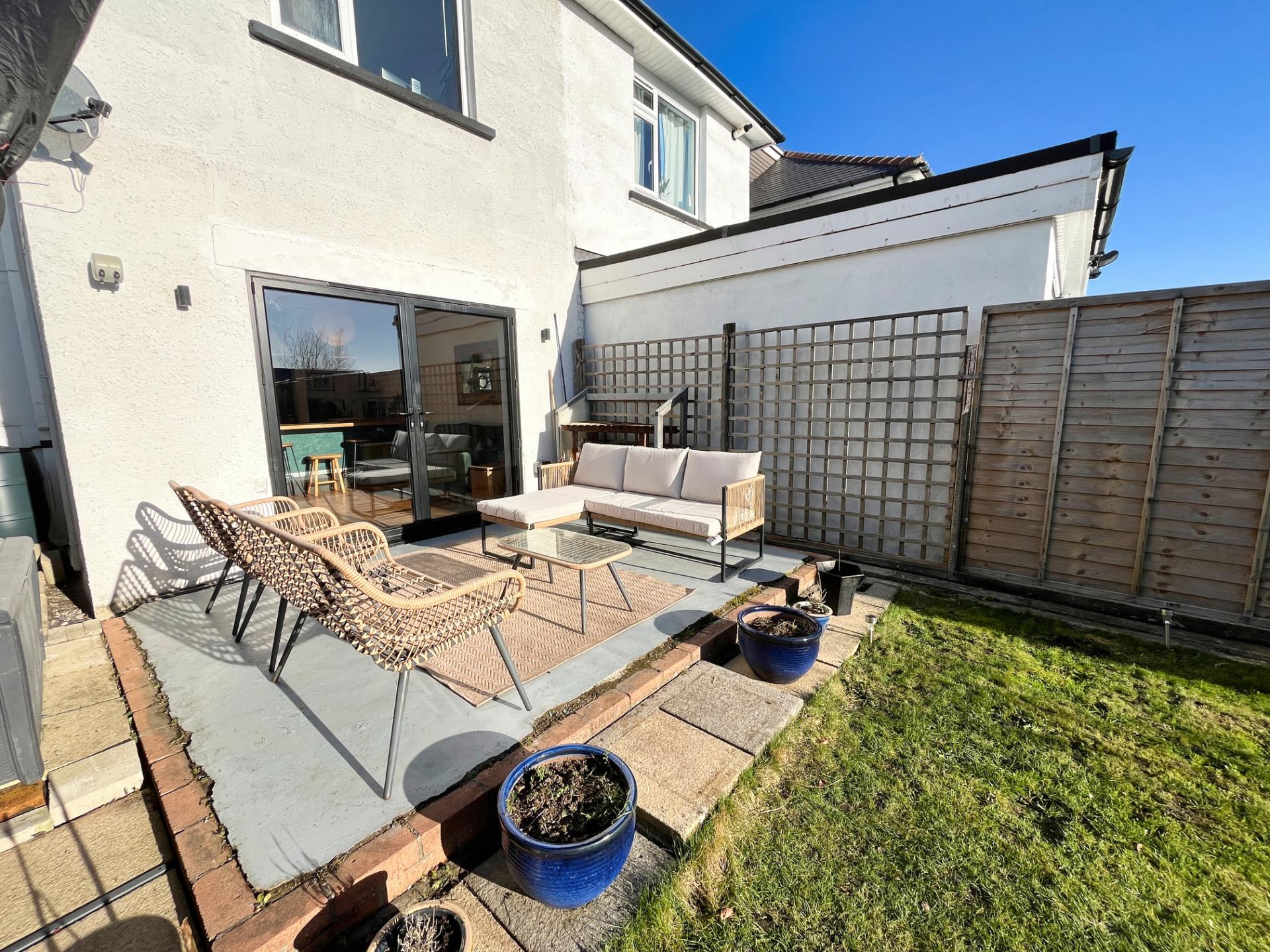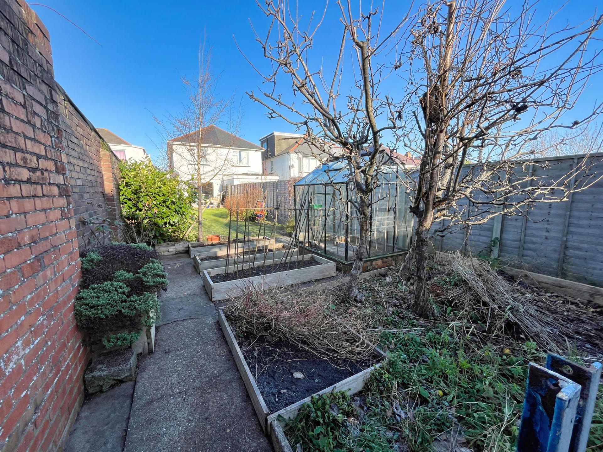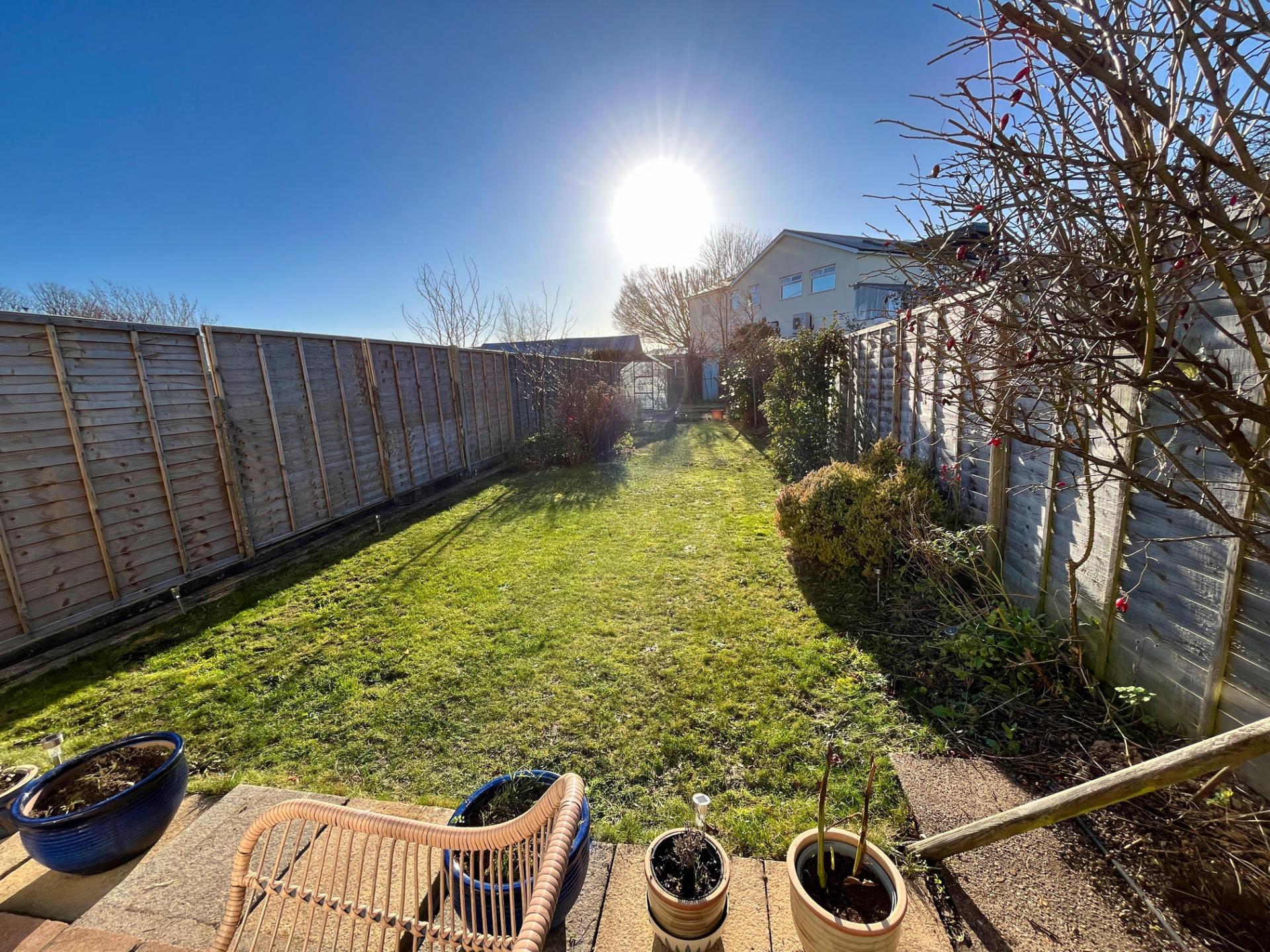 - Beautiful south facing rear garden with lawn, seating area, and kitchen garden that enjoys the sun all day.