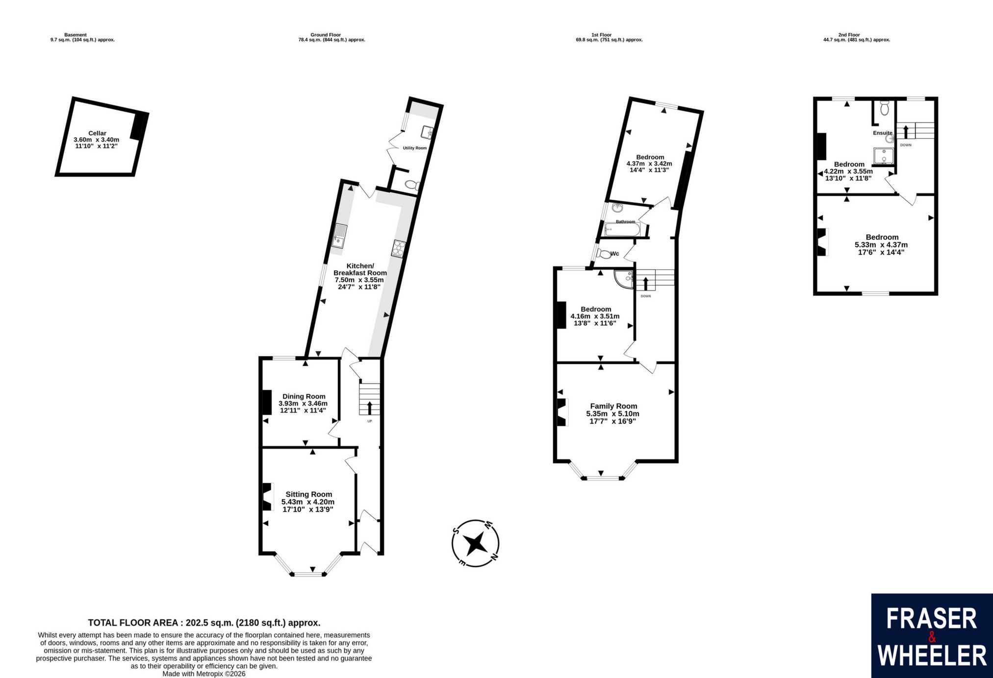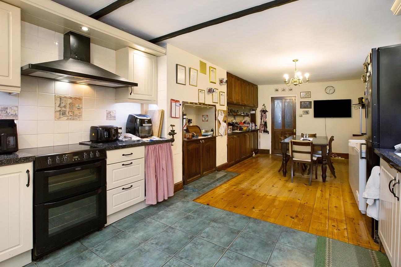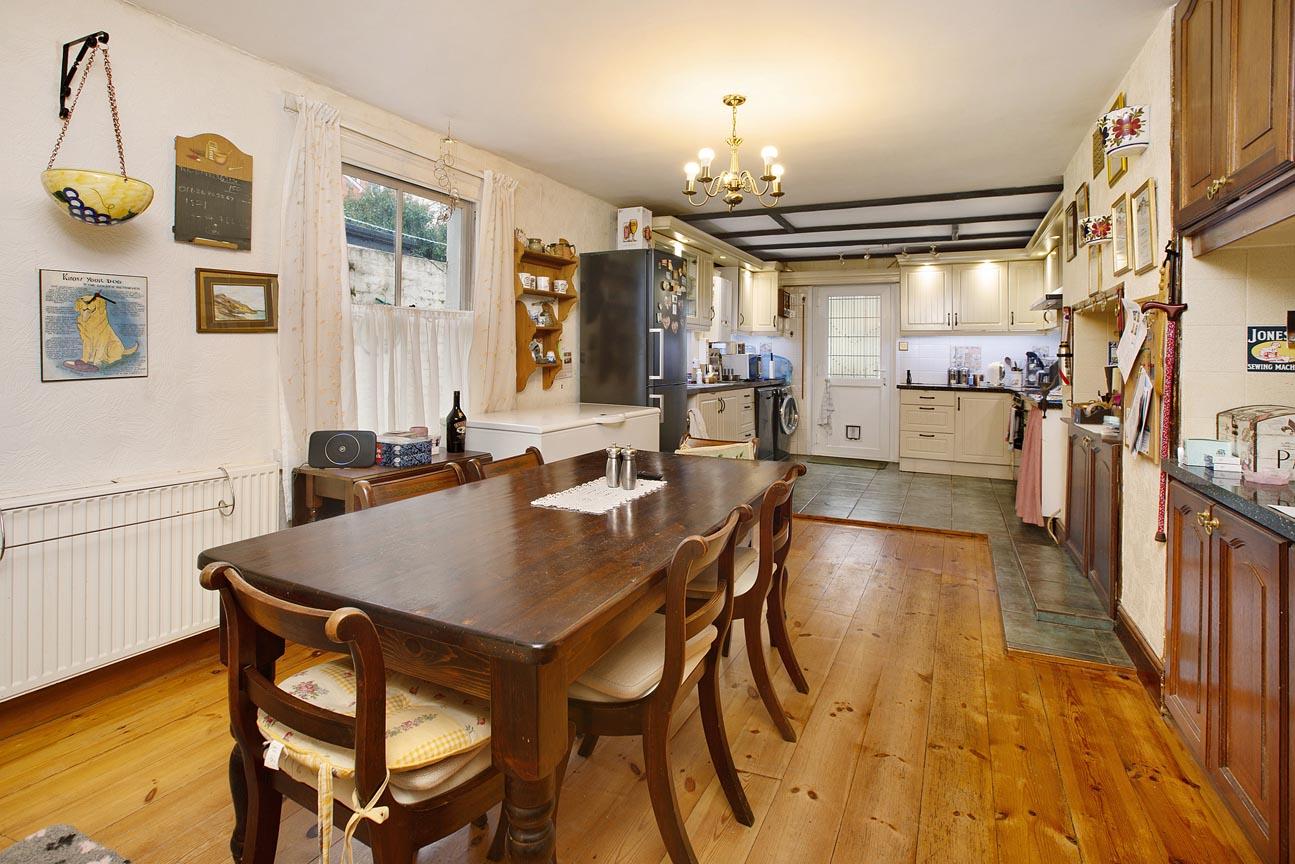 KITCHEN/BREAKFAST ROOM: A dual-aspect room with a sash window to the side and a glazed uPVC door providing access to the rear courtyard garden. Space for a dining table and chairs. Radiator and a comprehensive range of wall and base units with work surfaces over and tiled splashbacks. The kitchen area includes space for A cooker with large extractor canopy above, plumbing for a washing machine and dishwasher, inset stainless-steel sink with drainer, wall-mounted gas boiler supplying domestic hot water and central heating, and space for a large fridge/freezer. A trap door also provides access to a good size cellar.