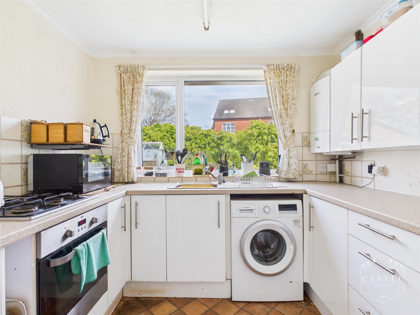 Kitchen - 2.74m x 2.40m (8'11" x 7'10" ) - having base units, drawers and wall cupboards, work surfaces with inset stainless steel sink with mixer tap and ceramic tiled splashbacks, space and plumbing for washing machine, built in electric oven and gas hob, space for fridge freezer and upvc double glazed window to rear.