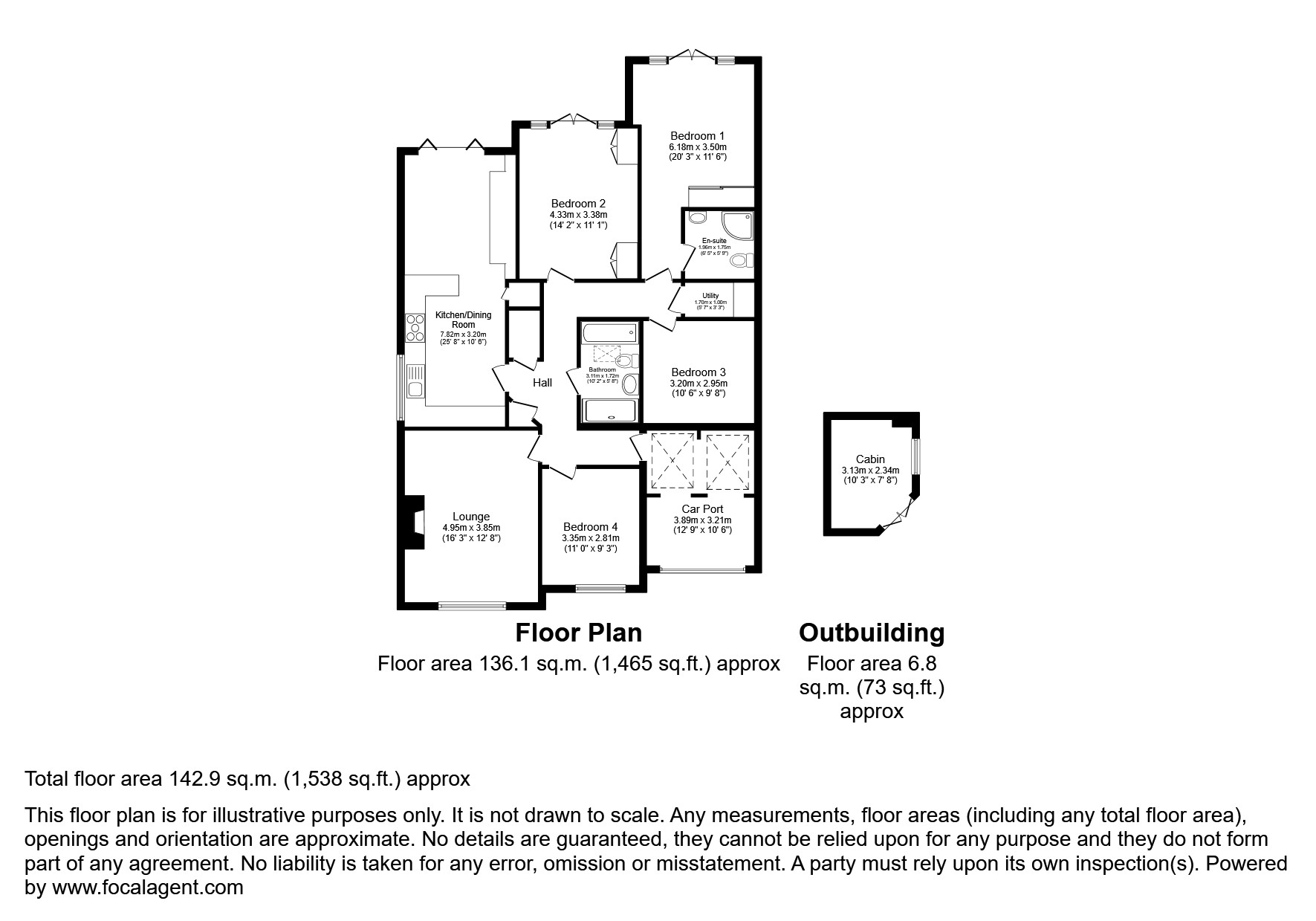 Jacobs Properties is delighted to bring to the market this versatile 4 double bedroom detached bungalow. Presented in immaculate condition throughout the property foot print totals an impressive 1528sq ft and consists of a living room with feature wood burner, a study, a large kitchen dining room with bi fold doors, 4 double bedrooms with master ensuite, a family bathroom, a utility room and a separate external garden studio/home office.