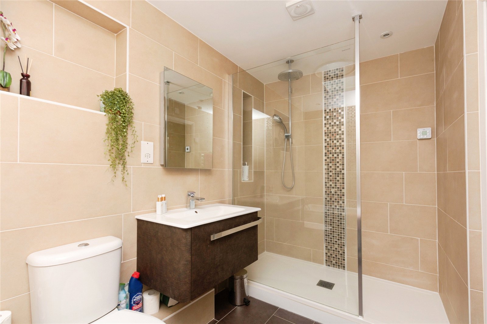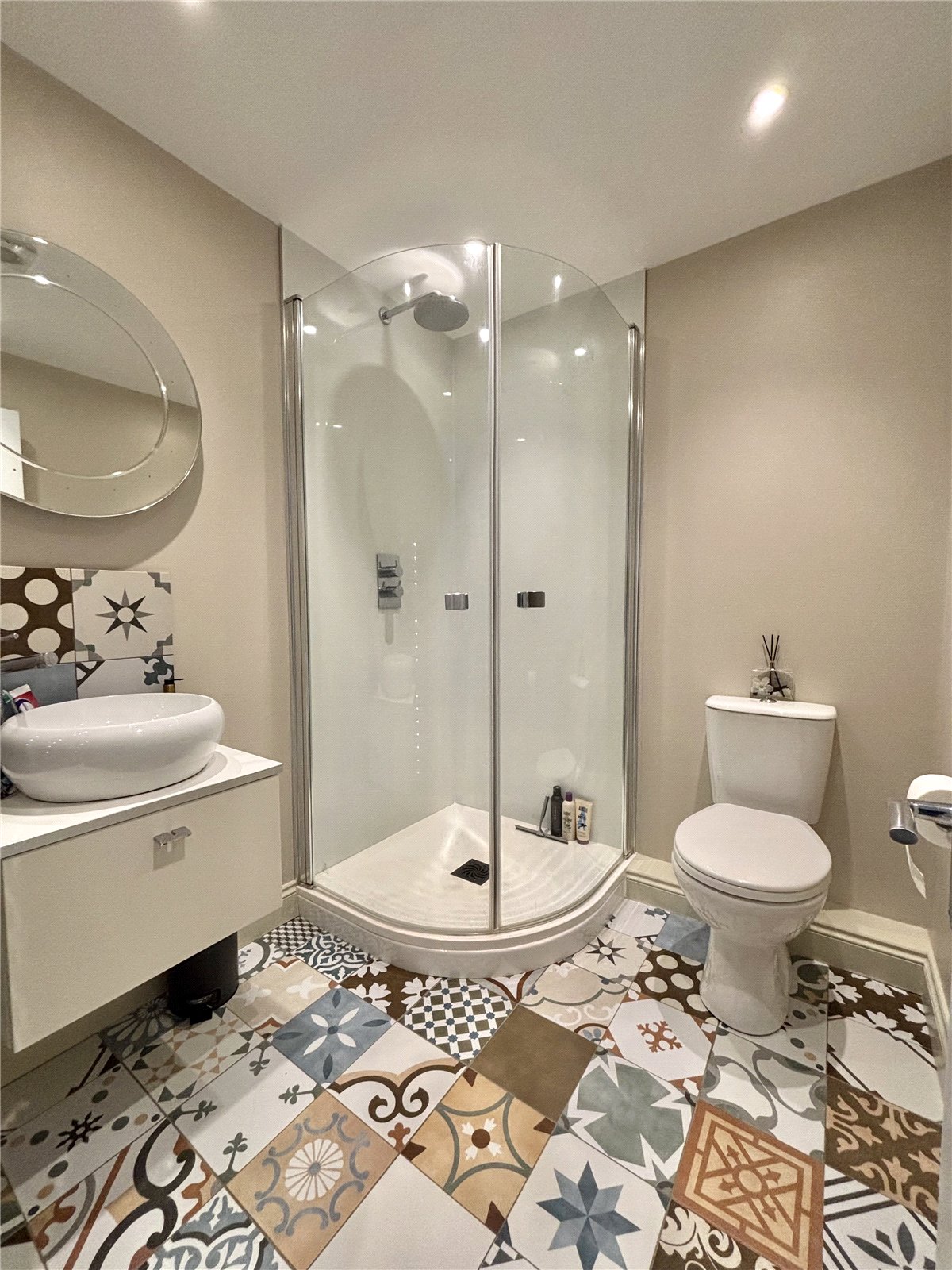 Family Bathroom - Side aspect room with electric Velux window and light tunnel. Suite comprises of double shower, bath, large wash hand basin and WC. Ceramic tiled flooring with heated towel rail and underfloor heating.