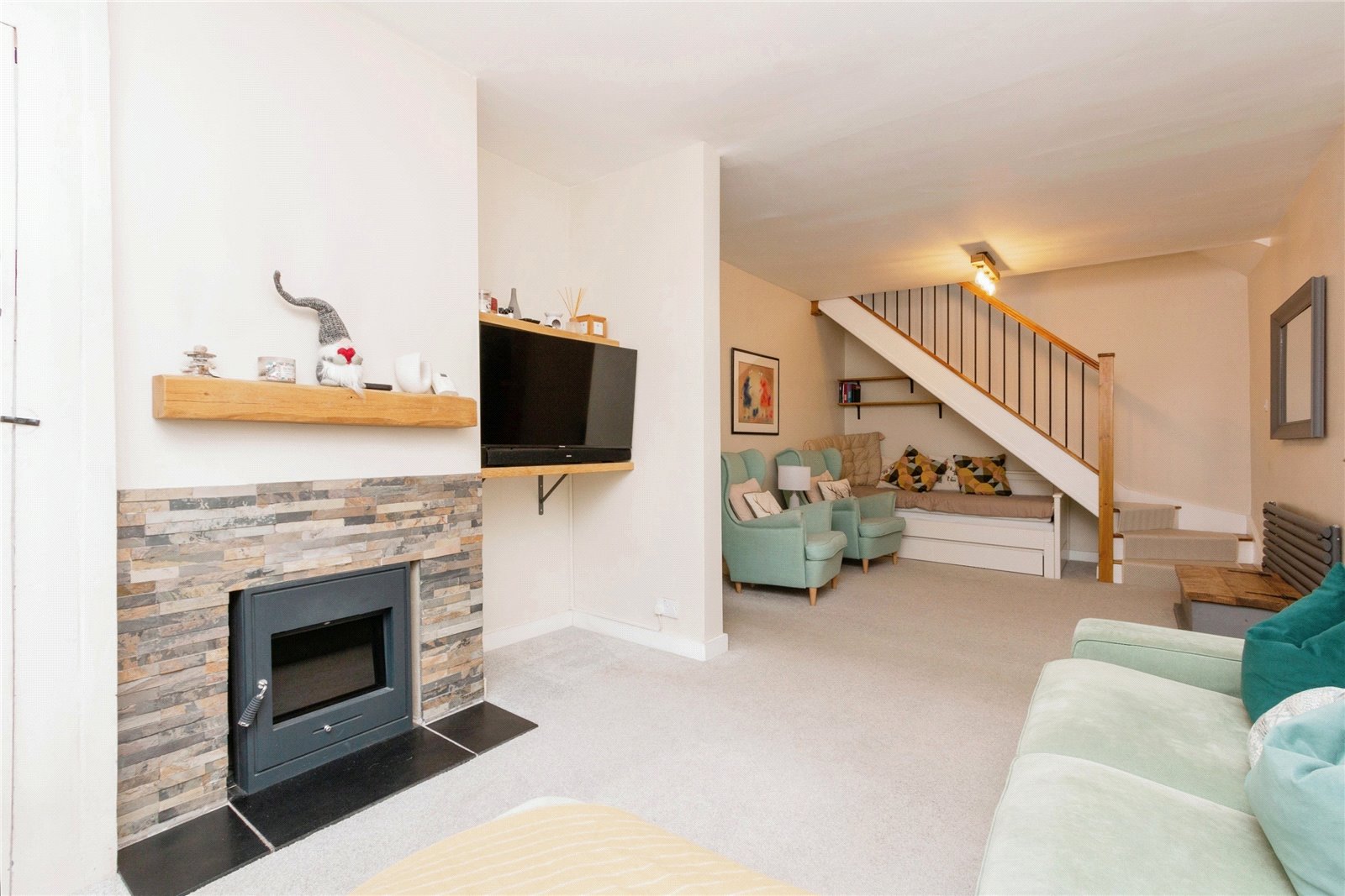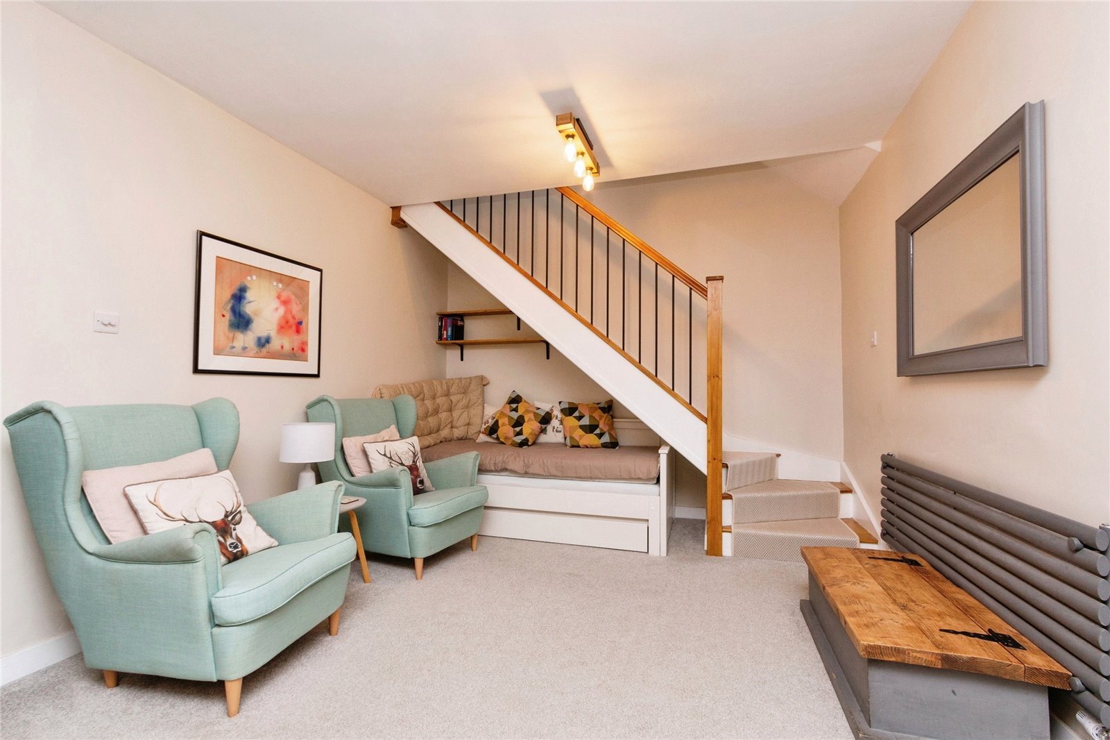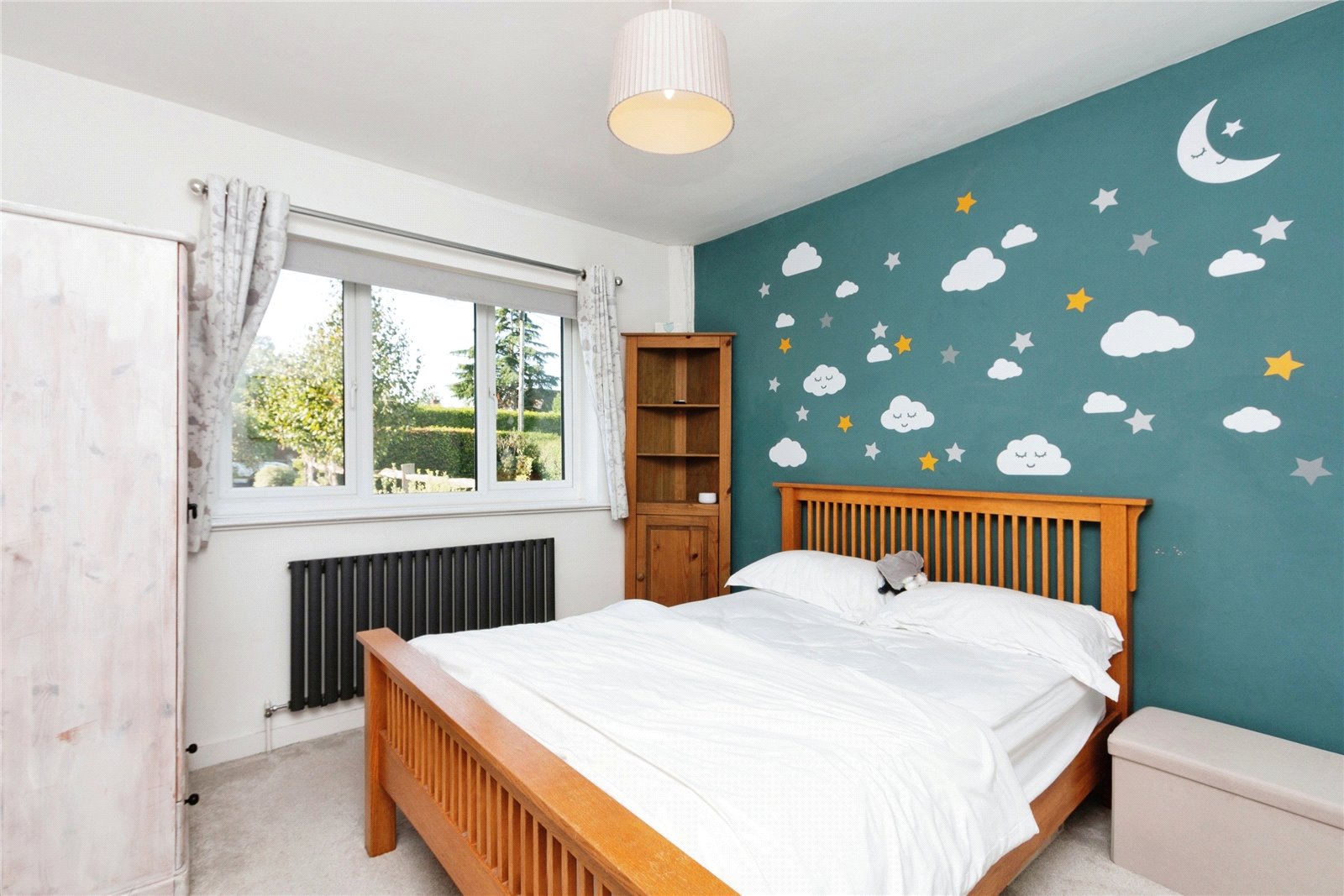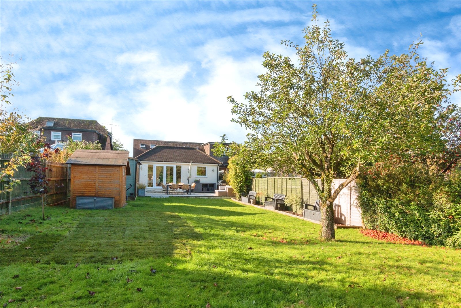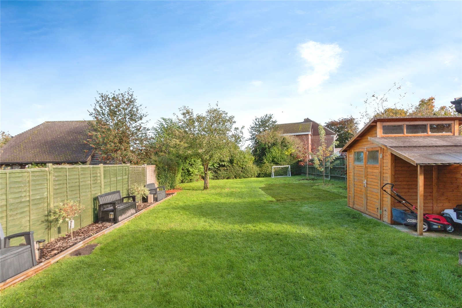 The peaceful private garden is mainly laid to lawn along with carefully selected planted trees, with a mix of hedge and fence to surround. A good-sized garden shed provides for storage.