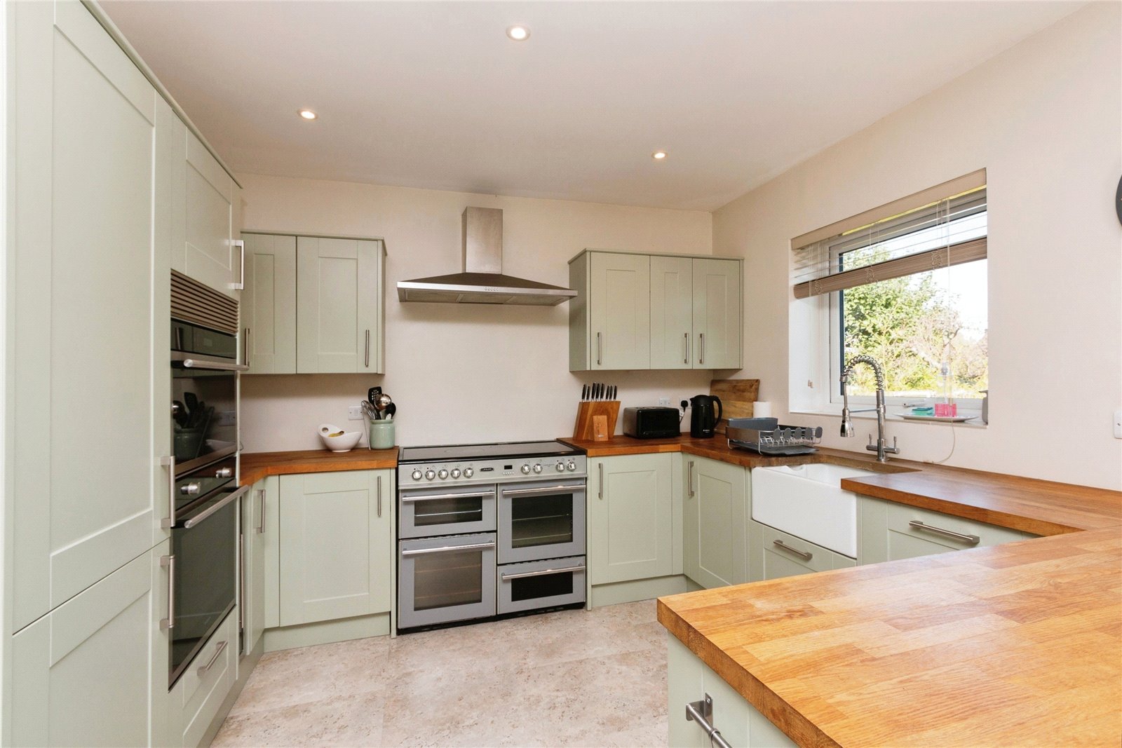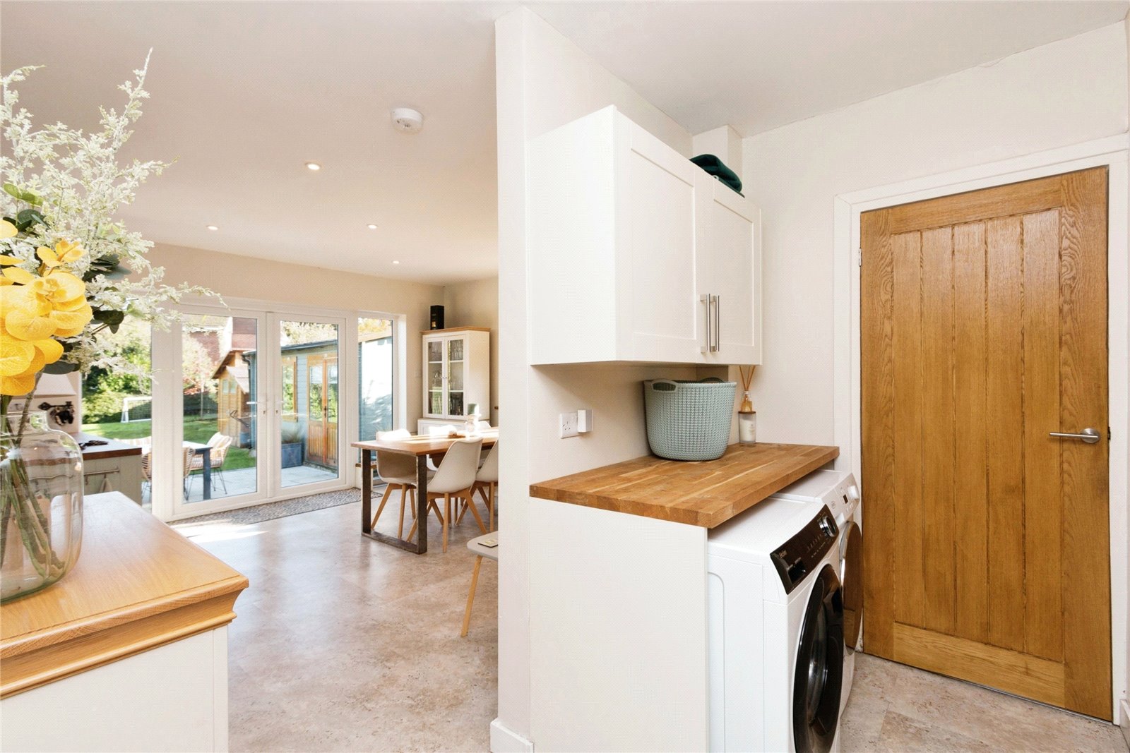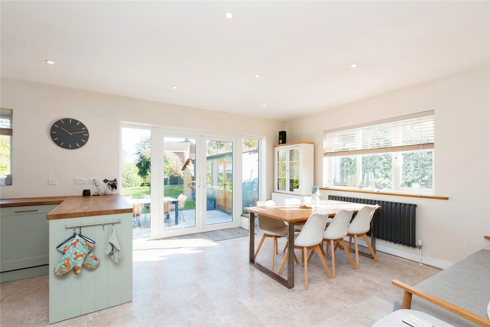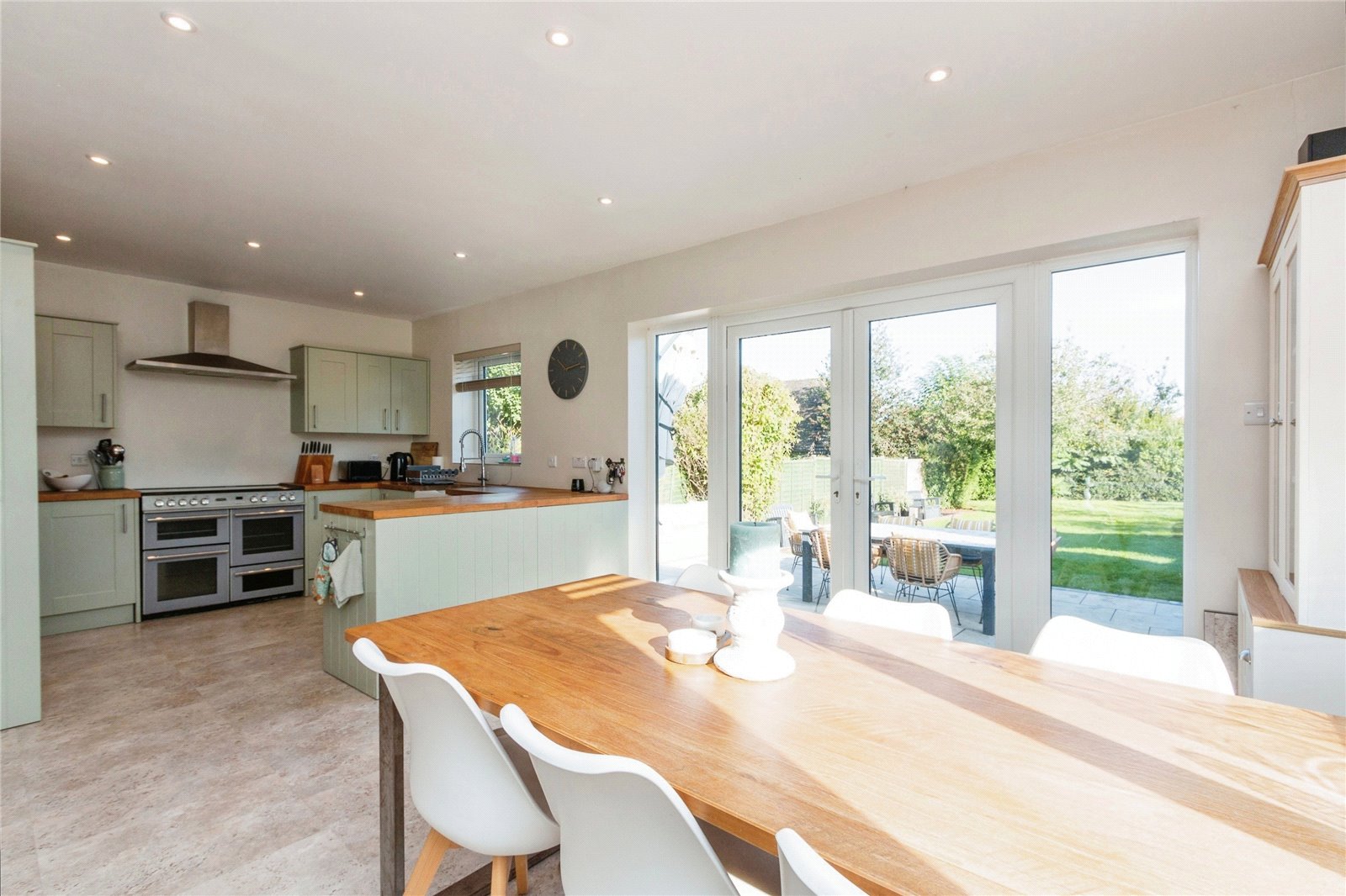 The rear of the property features a light and spacious open plan kitchen diner with kitchen bar, electric range cooker, three ovens, additional integrated microwave / oven, butler sink, dishwasher, ample low and high cupboard space plus utility area with washing machine and tumble dryer. French doors open onto a patio BBQ area, perfect for outdoor entertaining and relaxation.