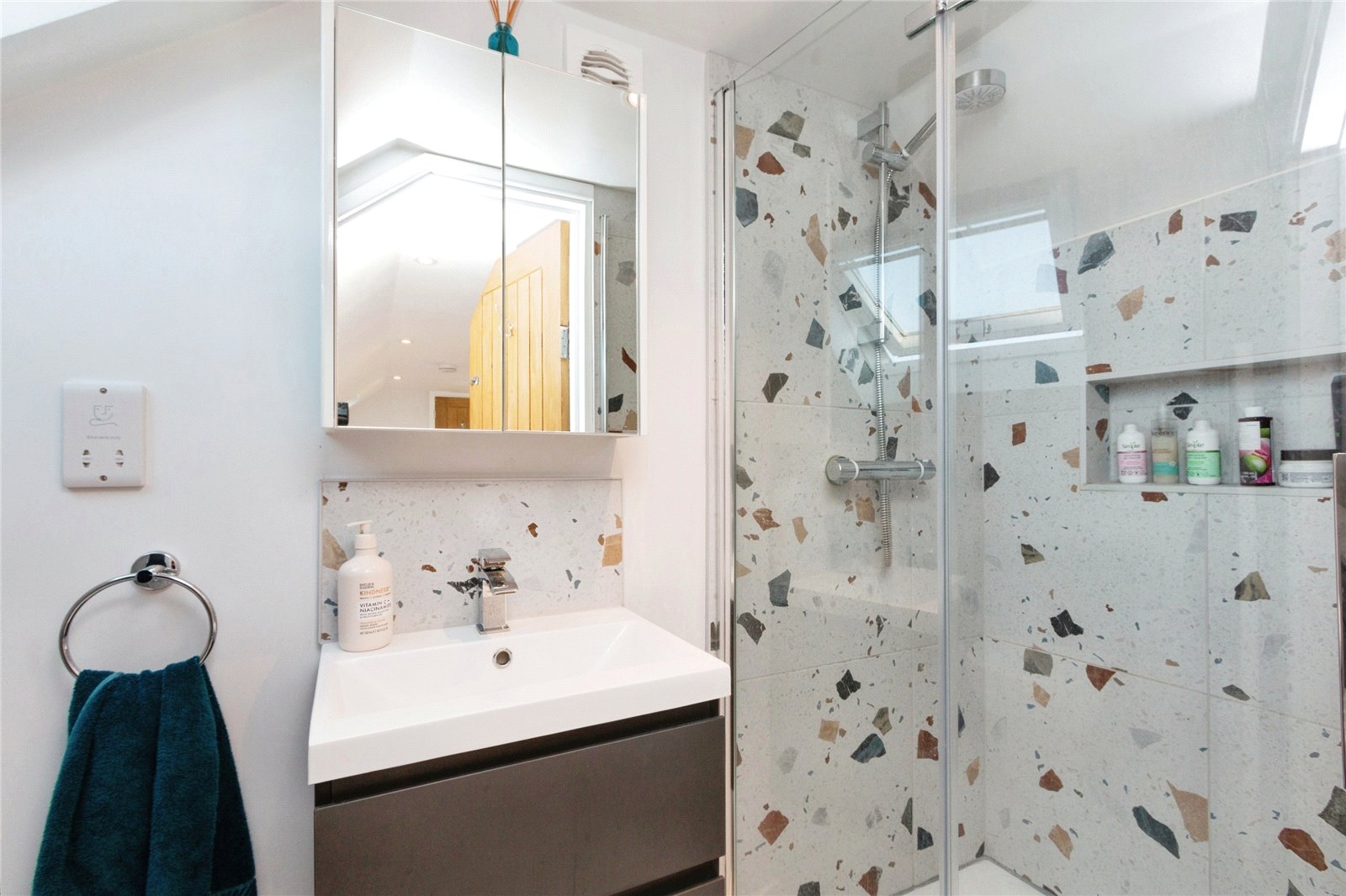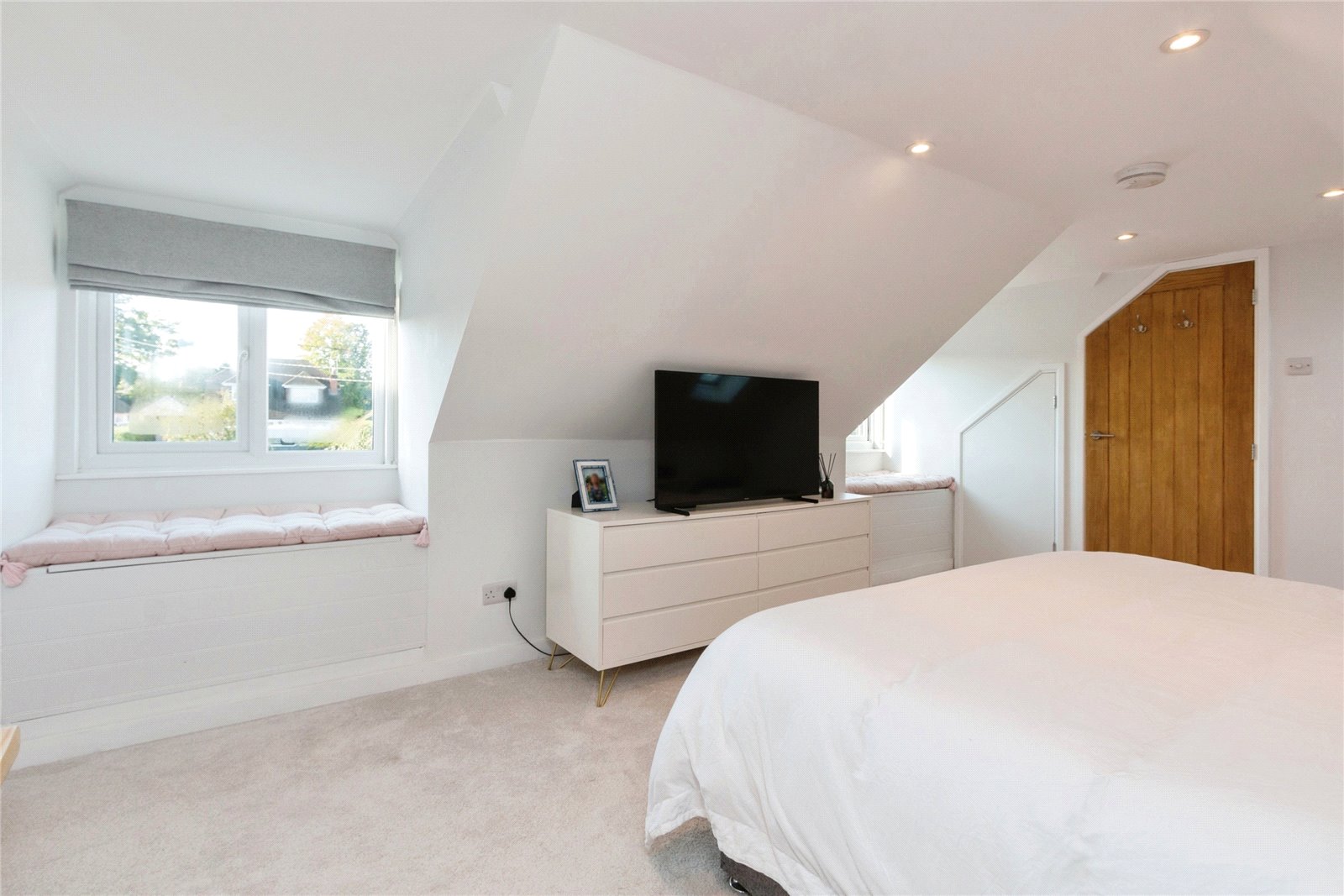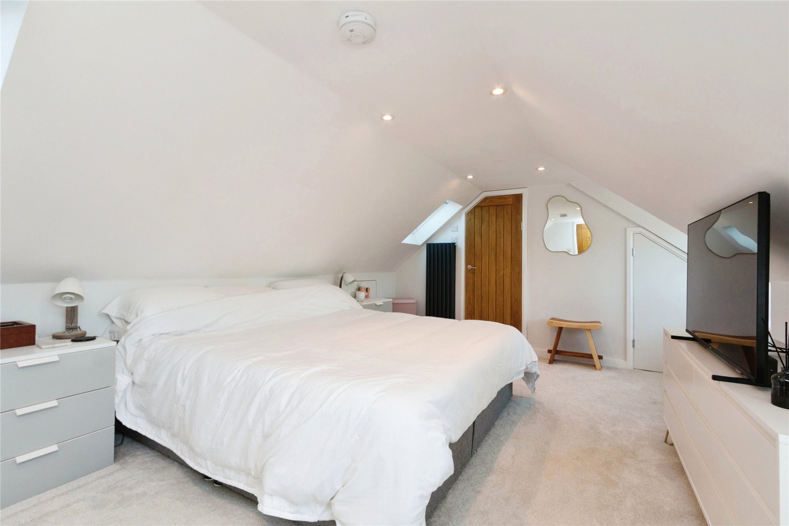 Upstairs, the main bedroom with en suite spans the property's width, featuring Dormer and Velux windows that flood the space with light from both sides. Multiple doors provide access to eaves storage.
