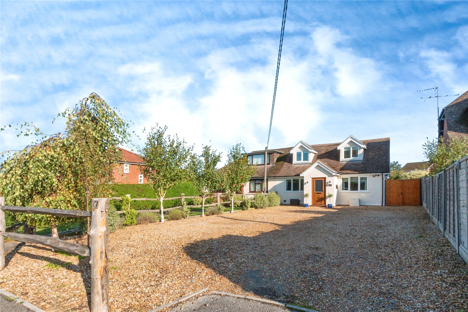 To the front is a large, gravelled driveway which provides ample parking for at least four cars.