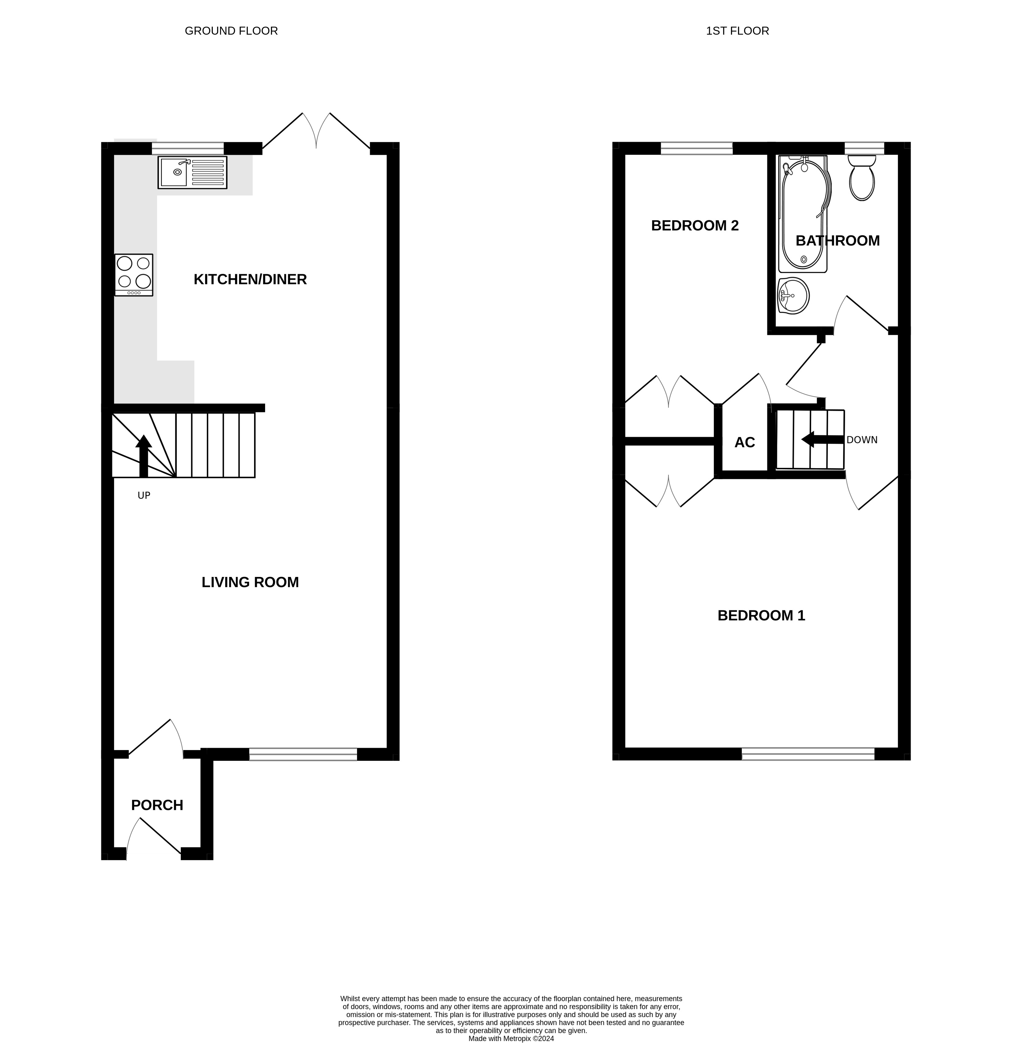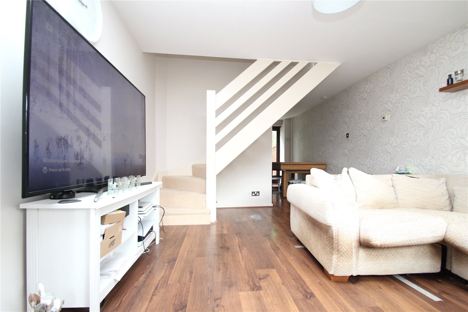 The ground floor features an open-plan layout with porch entrance, lounge, kitchen and dining area. The kitchen provides direct access to the rear garden. On the first floor, there are two bedrooms, both with built-in storage and a family bathroom.