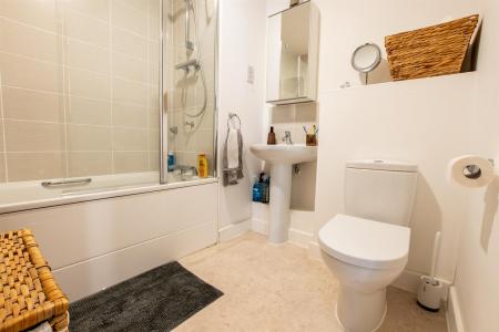 Bathroom - 2.29m x 2.16m (7'6 x 7'1) - A well presented bathroom with a bath, shower over and a glass shower screen. A toilet with useful shelf above. Pedestal wash hand basin with a tiled splash back matching the part tiled walls.