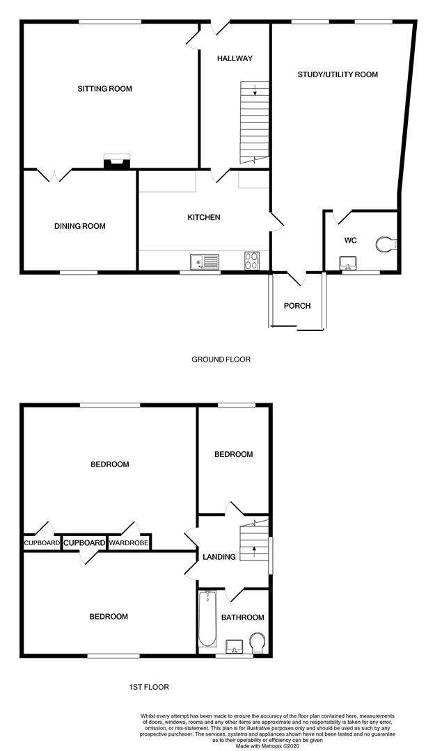 The first floor offers a modern bathroom with a white suite and tiled walls plus three sizeable bedrooms. Two of which have fitted storage cupboards.