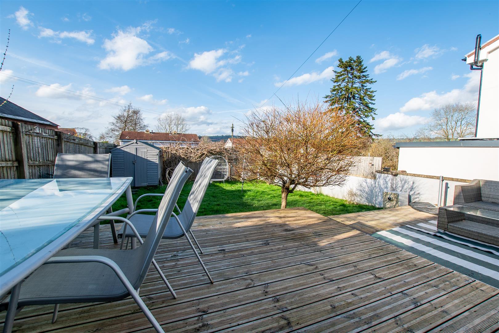 Rear Garden - An expansive decked area offers ample space for outdoor dining, perfect for alfresco meals, and additional space for seating ideal for entertaining or simply relaxing. The remainder of the generous garden is mainly laid to lawn and is enclosed by fencing and a wall. A pathway at the rear of the garden leads to a parking area with space for two cars.