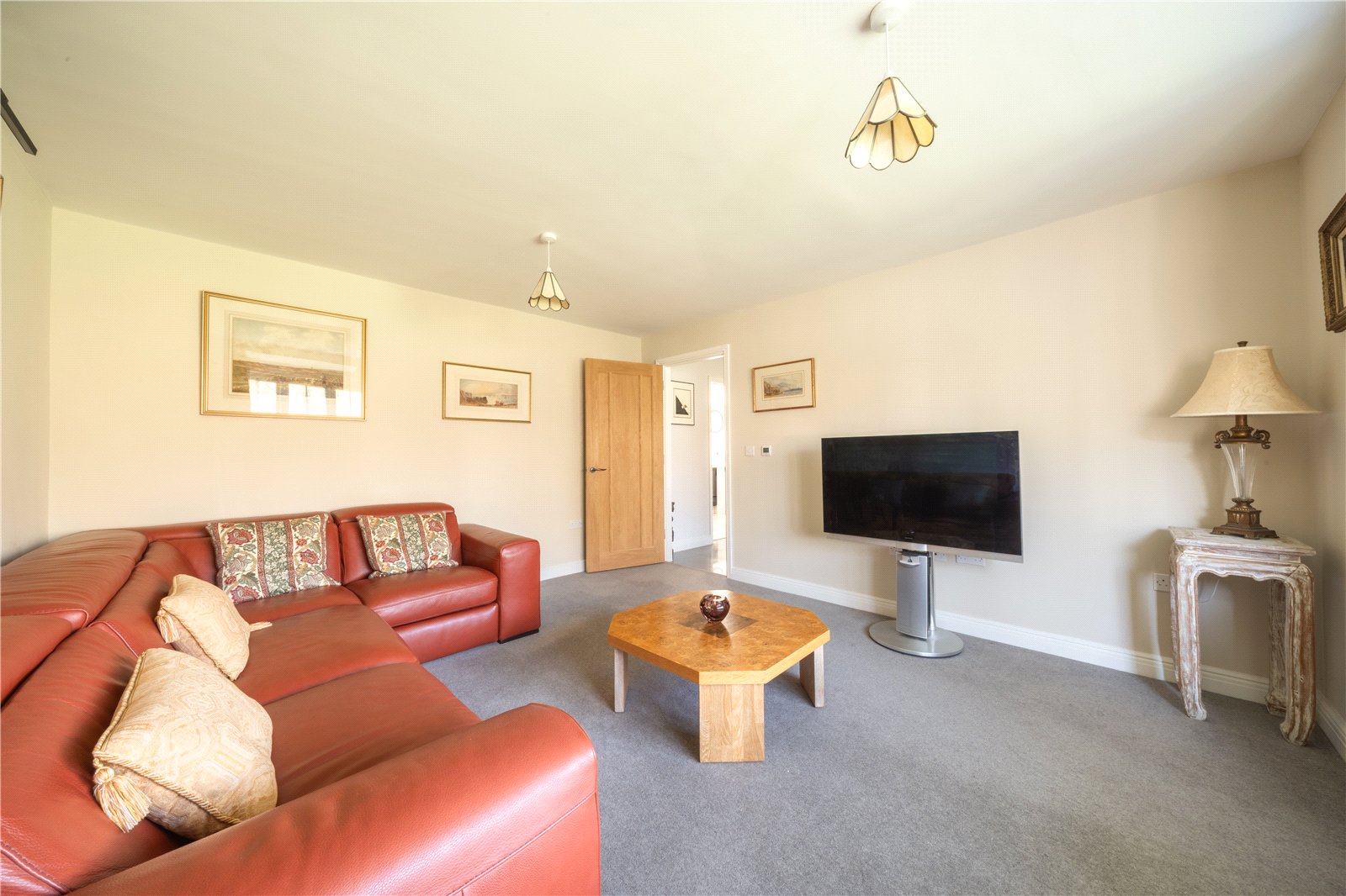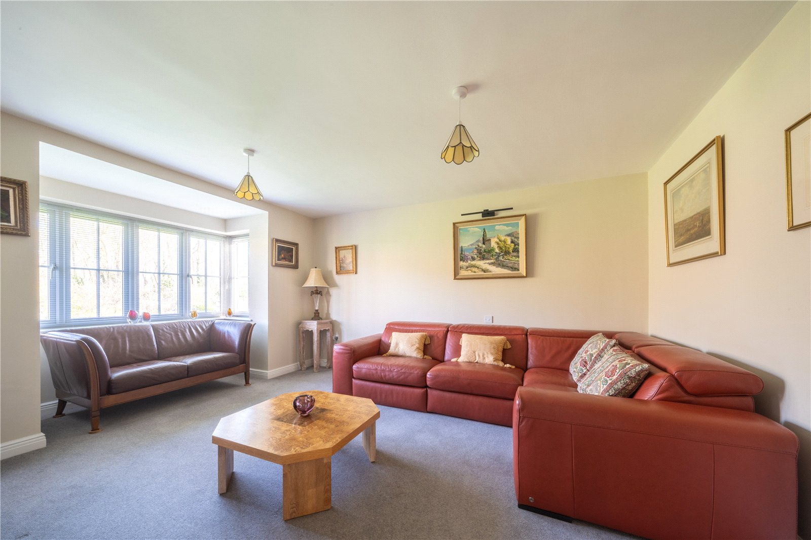 SITTING ROOM: A well-proportioned and comfortable sitting room enjoying an abundance of natural light from a large bay window overlooking the garden. The room offers generous space for a variety of seating arrangements and is finished with soft neutral décor and fitted carpeting, creating a warm and inviting atmosphere. The bay window forms an attractive feature of the room while providing an ideal area for additional seating or a reading space. Double doors connect conveniently to the adjoining living areas, allowing for an easy flow throughout the ground floor and making the space well suited to both everyday family living and entertaining.