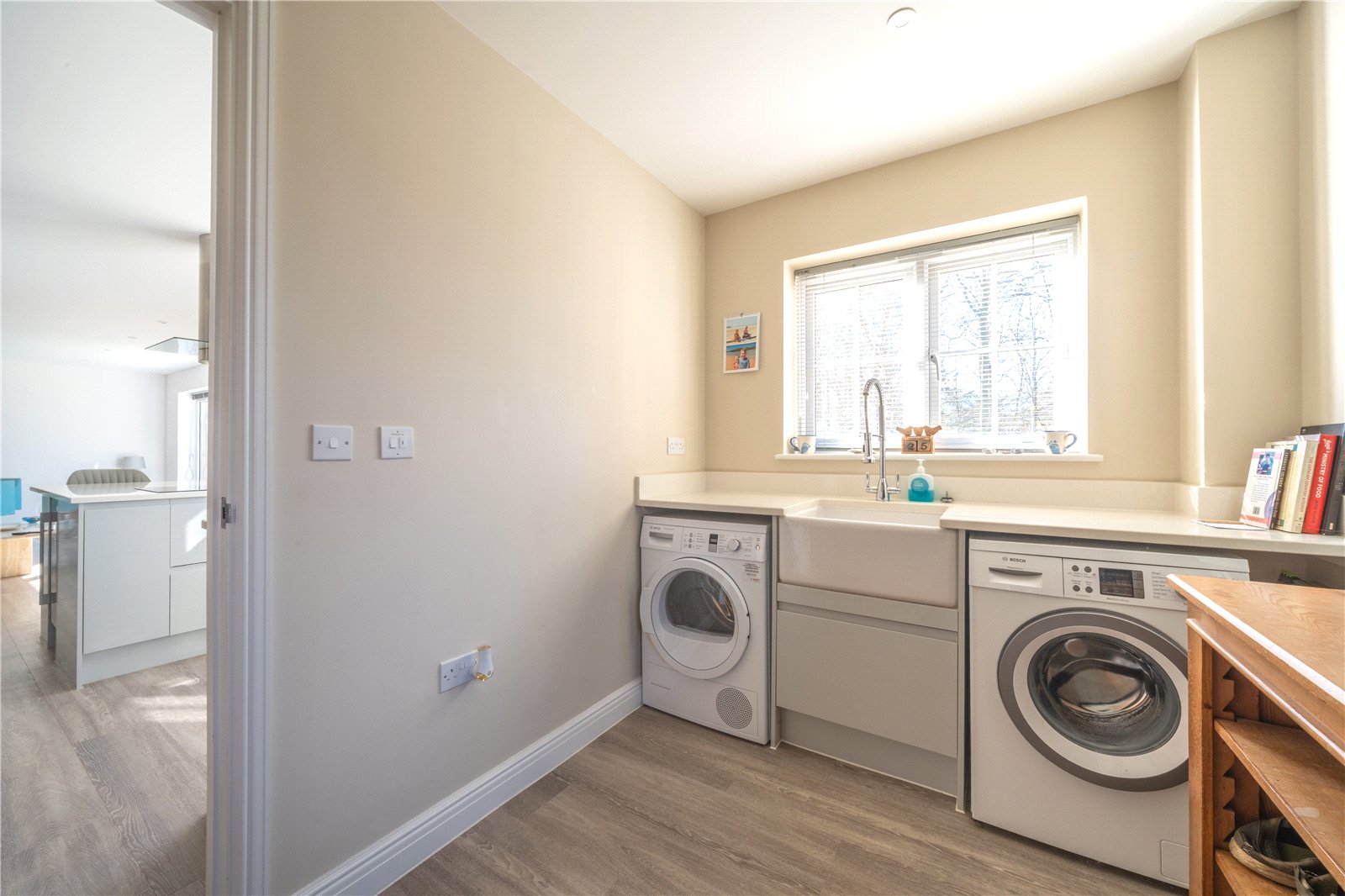 UTILITY ROOM: A practical and well-appointed utility room located just off the kitchen, providing additional space for laundry and household tasks. The room is fitted with work surfaces incorporating a Belfast-style sink with mixer tap and space for both a washing machine and tumble dryer beneath. A window above the sink allows for good natural light while offering pleasant views outside. Finished with wood-effect flooring and neutral décor, the room also provides useful additional storage space and serves as an ideal secondary preparation and laundry area away from the main kitchen.