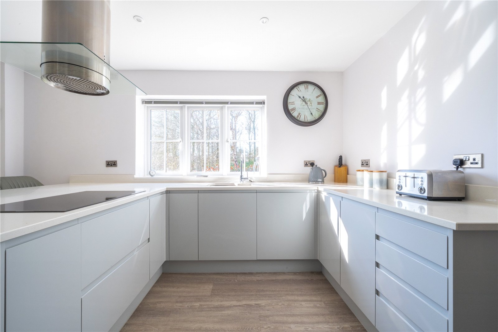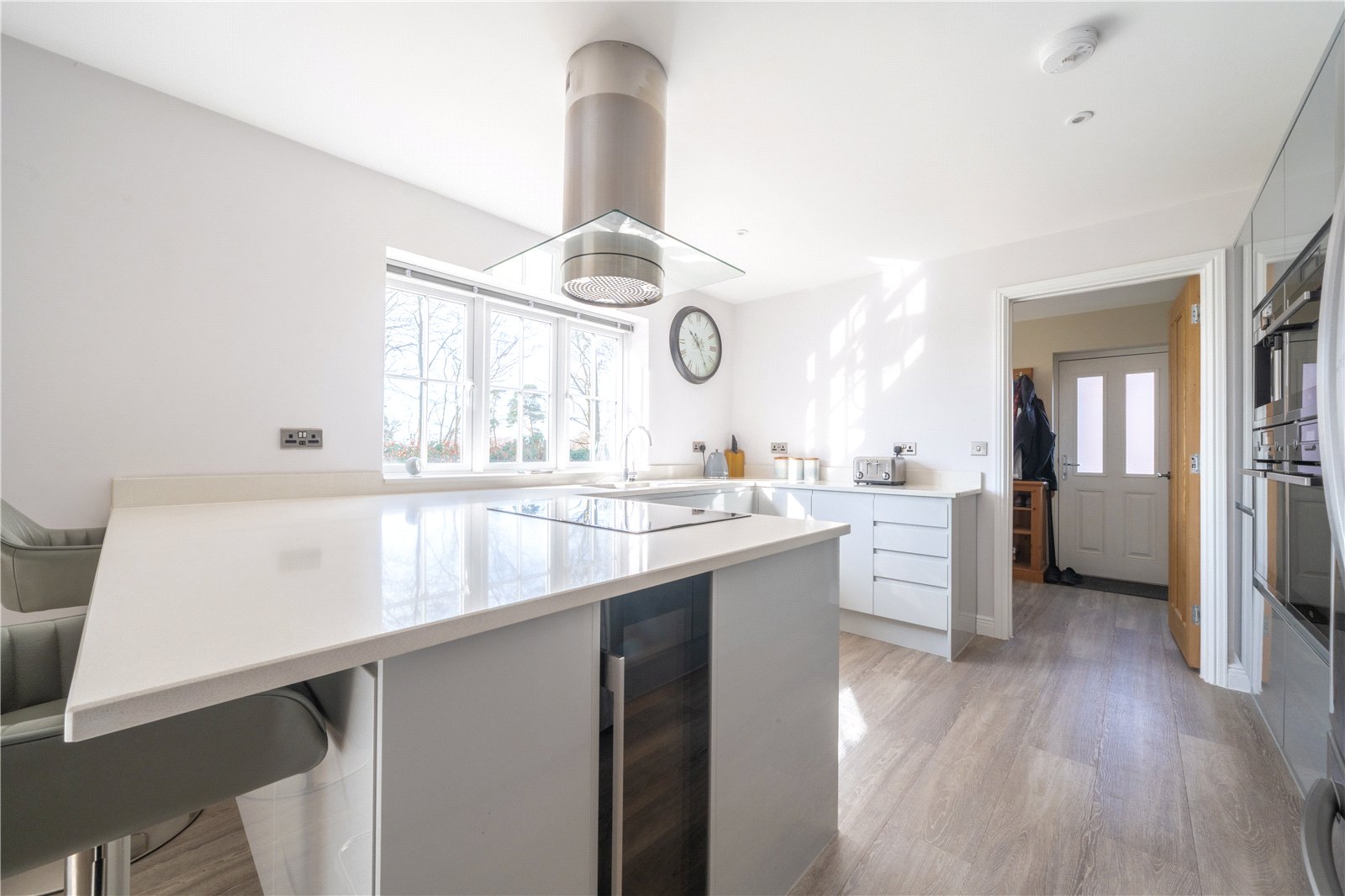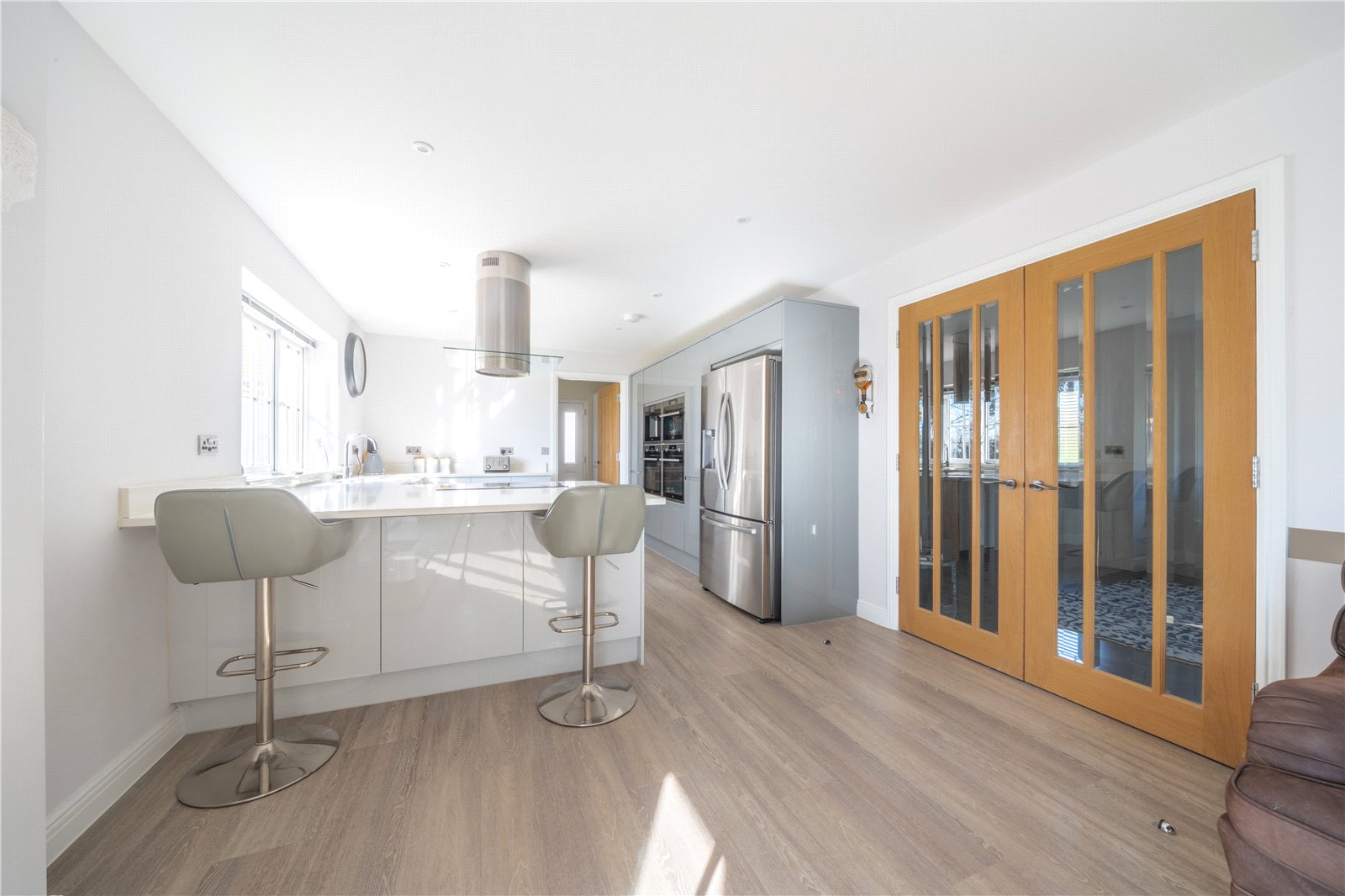 The contemporary kitchen is fitted with a comprehensive range of sleek wall and base units complemented by generous work surfaces and a central island with breakfast bar seating. Integrated appliances include multiple ovens, an induction hob with overhead extractor, and further fitted appliances, with additional space provided for a large American-style fridge freezer. A window above the sink enjoys pleasant outlooks over the garden, while recessed ceiling lighting and wood-effect flooring complete the modern finish.