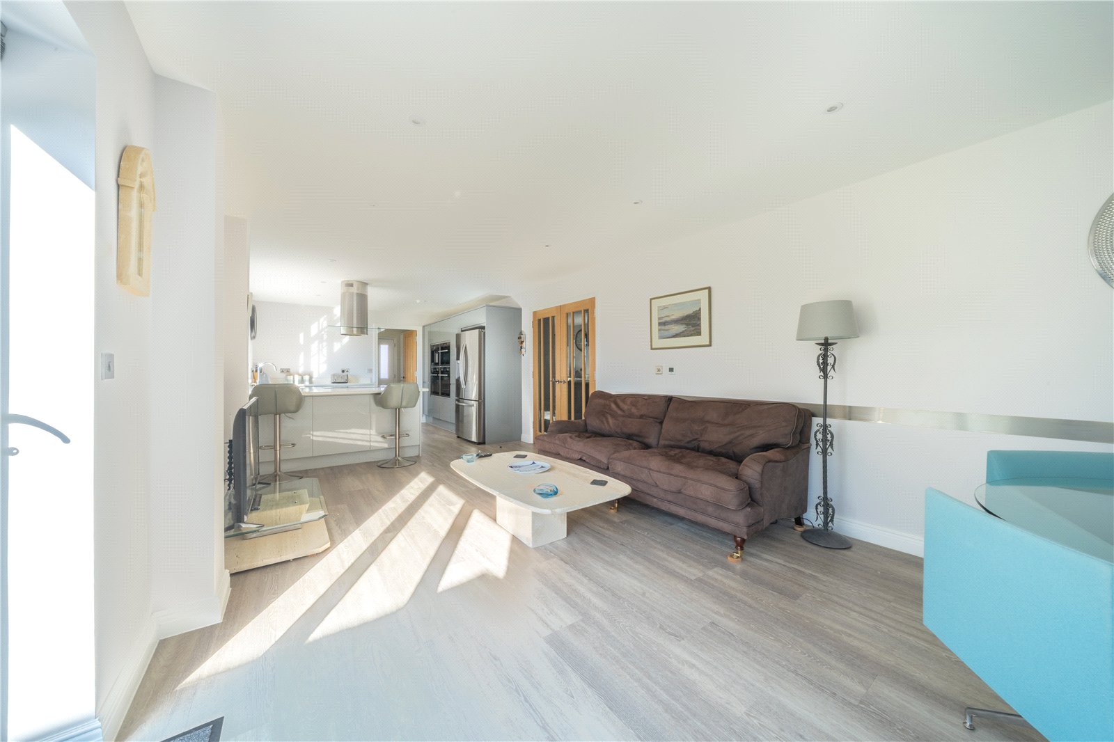 The room flows seamlessly into a comfortable family seating area and a dedicated dining space, creating a versatile environment ideal for everyday family life as well as entertaining guests. The sliding doors provide direct access to the garden, enhancing the indoor-outdoor feel and making this an exceptional social and living space.