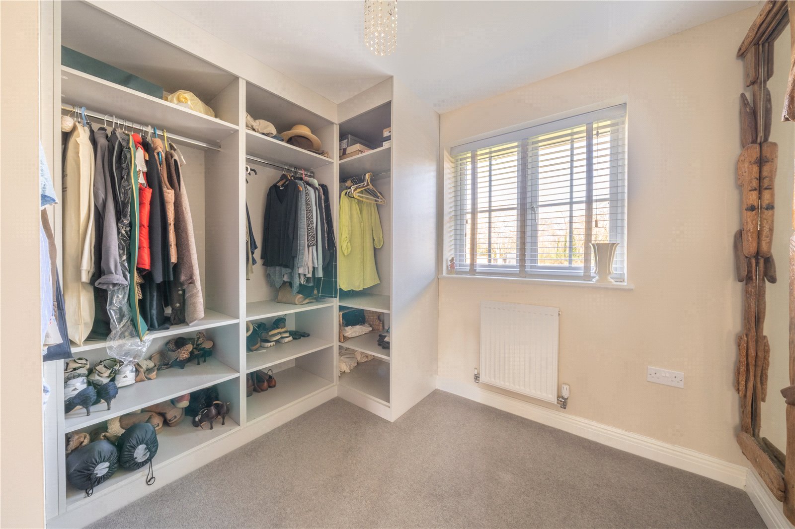 DRESSING ROOM: A well-designed dressing room fitted with an extensive range of open wardrobes and shelving, providing excellent hanging space and storage for clothing, shoes and accessories. The room benefits from a window allowing natural light to brighten the space, while the neutral décor and fitted carpeting create a comfortable and practical environment. Conveniently positioned adjoining the bedroom and en-suite, this dedicated dressing area adds both functionality and luxury to the principal suite.