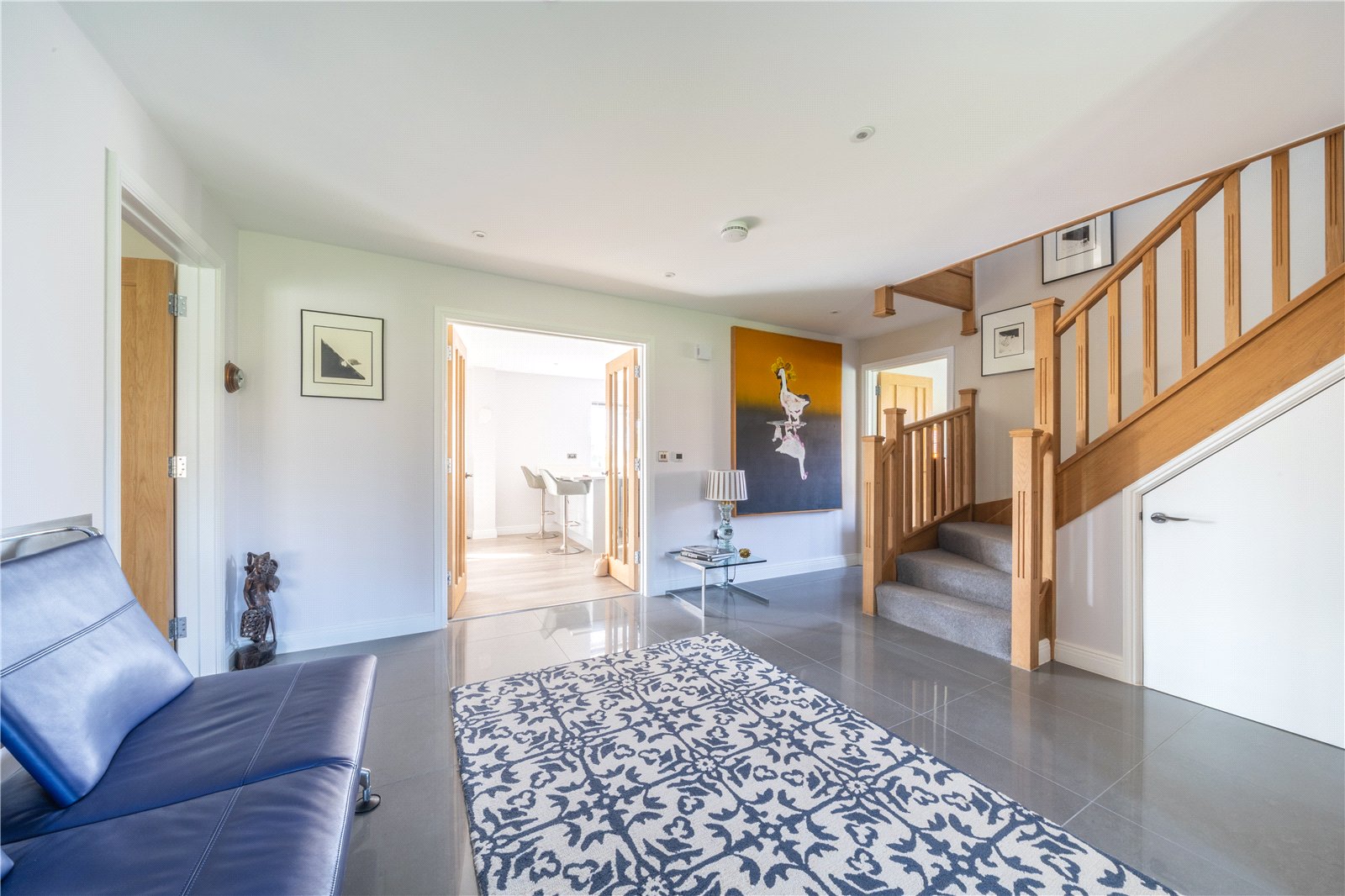 ENTRANCE HALL: A spacious and welcoming entrance hall creating an immediate sense of light and openness upon arrival. The area features sleek tiled flooring, recessed ceiling lighting and a staircase rising to the first floor with attractive wooden balustrade and carpeted steps. There is ample room for seating and display furniture, while large windows and glazed panels surrounding the front door allow natural light to flood the space. Double doors lead through to the principal reception areas, creating an excellent flow for both everyday living and entertaining, with additional doors providing access to further ground floor accommodation and useful under-stairs storage.