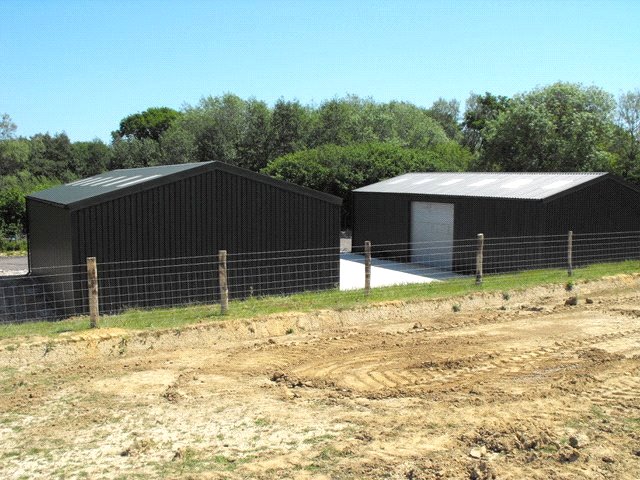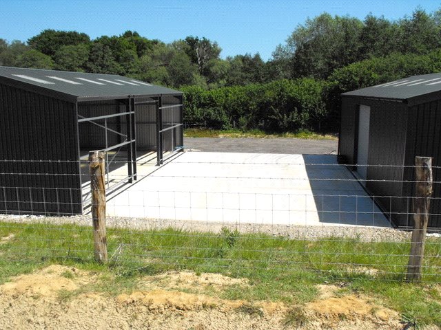 Beyond the interconnecting 6 inch thick concrete turning and access slab which has a further 6 inch sub base between the two buildings, is the second newly constructed metal framed and panelled 2100 square foot barn. It is a mirror image of the first barn, except it does not have an enclosed front entrance.