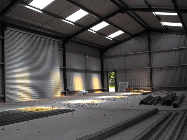 ROOF WITH TRANSLUCENT SKYLIGHTS. CONCRETE BASE. LARGE FRONT RETRACTABLE ROLLER SHUTTER METAL DOOR ENTANCE FOR HEAVY PLANT AND FARM MACHINERY.
