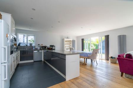 The heart of the home is the open plan kitchen/dining/family room providing a relaxed living space with two sets of sliding doors giving access to the garden. The family area has useful built in storage cabinets. The kitchen is fitted with a comprehensive range of base units with continuous reclaimed glass work surface over, inset stainless steel sink unit, separate boiling water tap. There is a range of matching eye level units. Integrated appliances include oven and Siemens 5 ring induction hob with extractor over. Central to the kitchen is the large counter with breakfast bar and storage cupboard below.