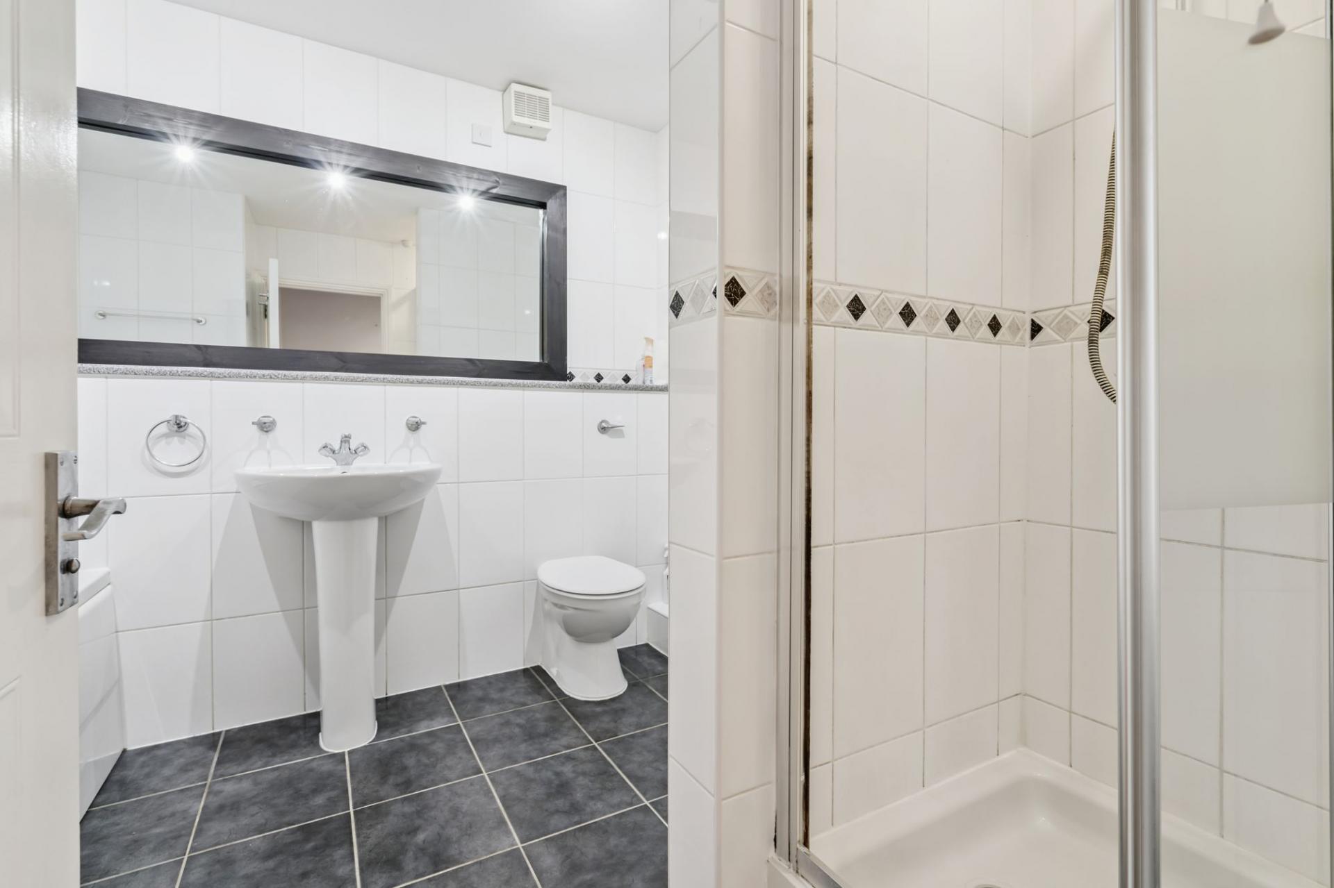 Continuing through the apartment, the bathroom is positioned on the right and benefits from both a separate shower and a full-sized bath, providing a spacious and practical layout. Further along the hallway is a second large double bedroom, also enjoying views over the communal area.