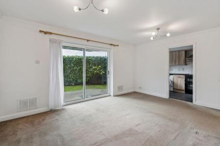 At the end of the apartment is a bright and spacious living area, featuring French doors that open out onto a private patio area, ideal for indoor-outdoor living. Just off the living room is the fully fitted kitchen, complete with integrated white goods.