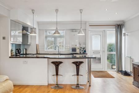 On entering, you are greeted with a fabulously spacious open-plan kitchen, living room, and dining room. The kitchen area features ample below and eye-level cupboards, a fitted extractor fan, and space for an oven and fridge. The breakfast bar offers plenty of seating for casual meals or can serve as a substitute for a formal dining table, with additional storage underneath.