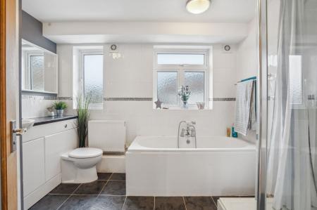 A glazed door leads through to the rest of the accommodation. The generously proportioned bathroom is well-appointed with a bath featuring a tap/shower mixer, a walk-in shower with dual rainfall and handheld shower heads, and a large vanity unit housing a fitted sink and WC. There is also a large storage cupboard with plumbing for a washing machine and space for a tumble dryer.