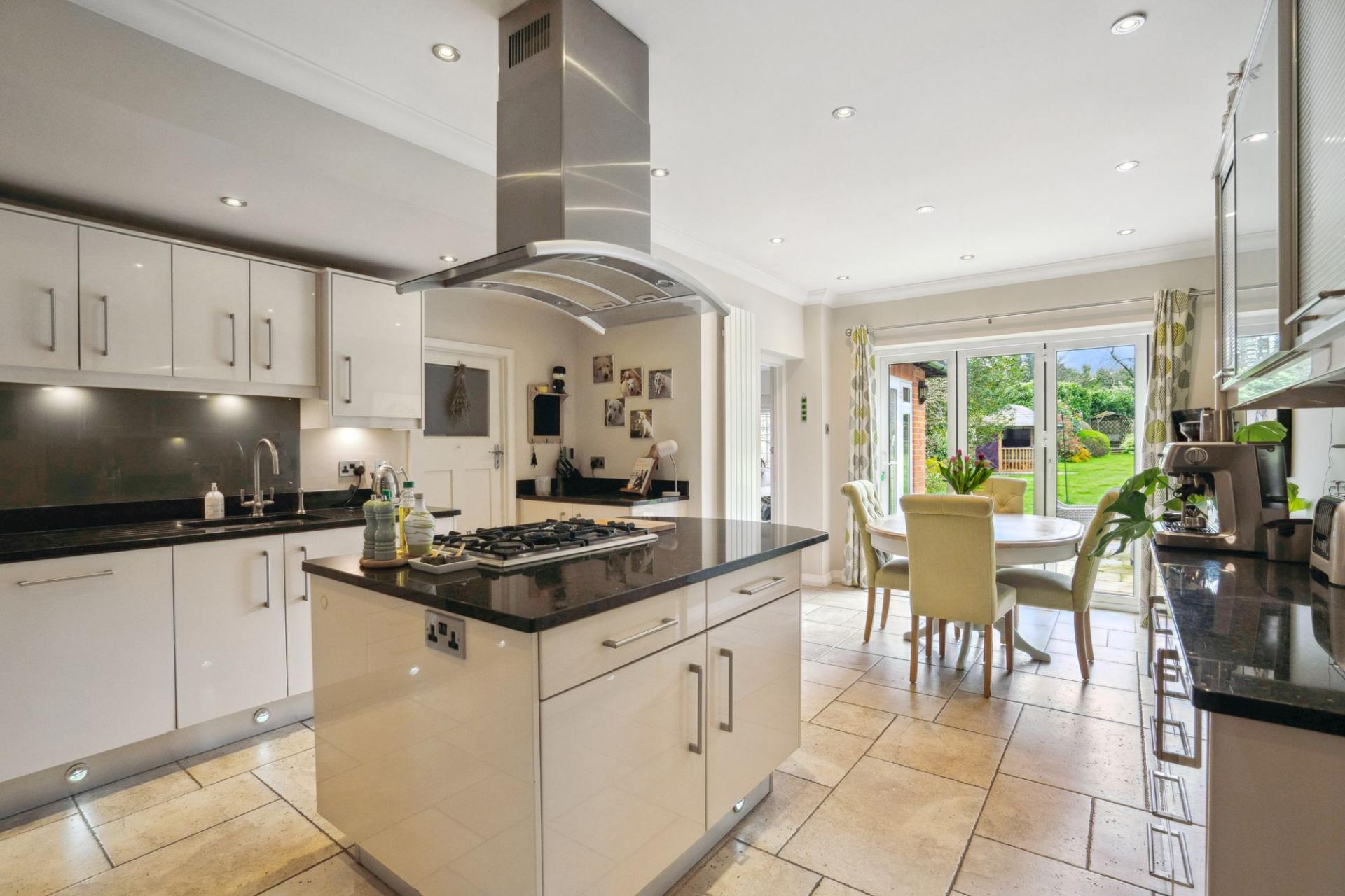 - Modern, fully fitted kitchen with central island, 5-ring gas hob, granite worktops, integrated Neff appliances, and bifold doors to terrace
