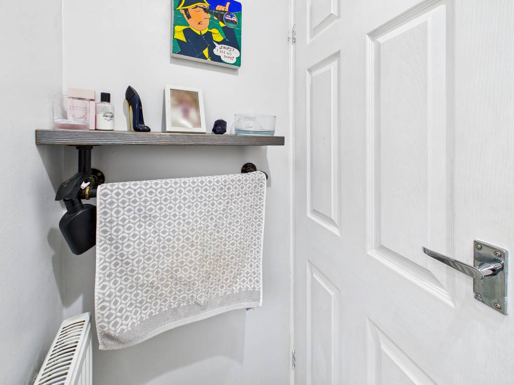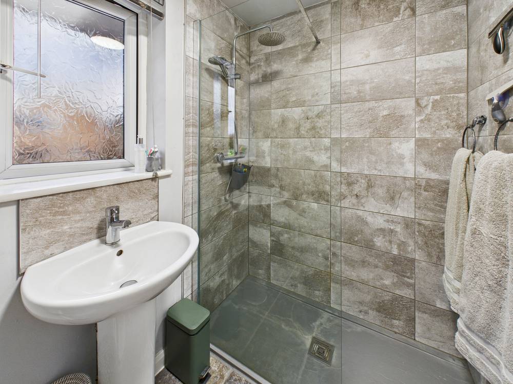 Extractor fan. UPVC frosted glass looking to the rear of the property. Stainless steel mixer tap over wash basin. Central heated towel rail. Overhead shower.