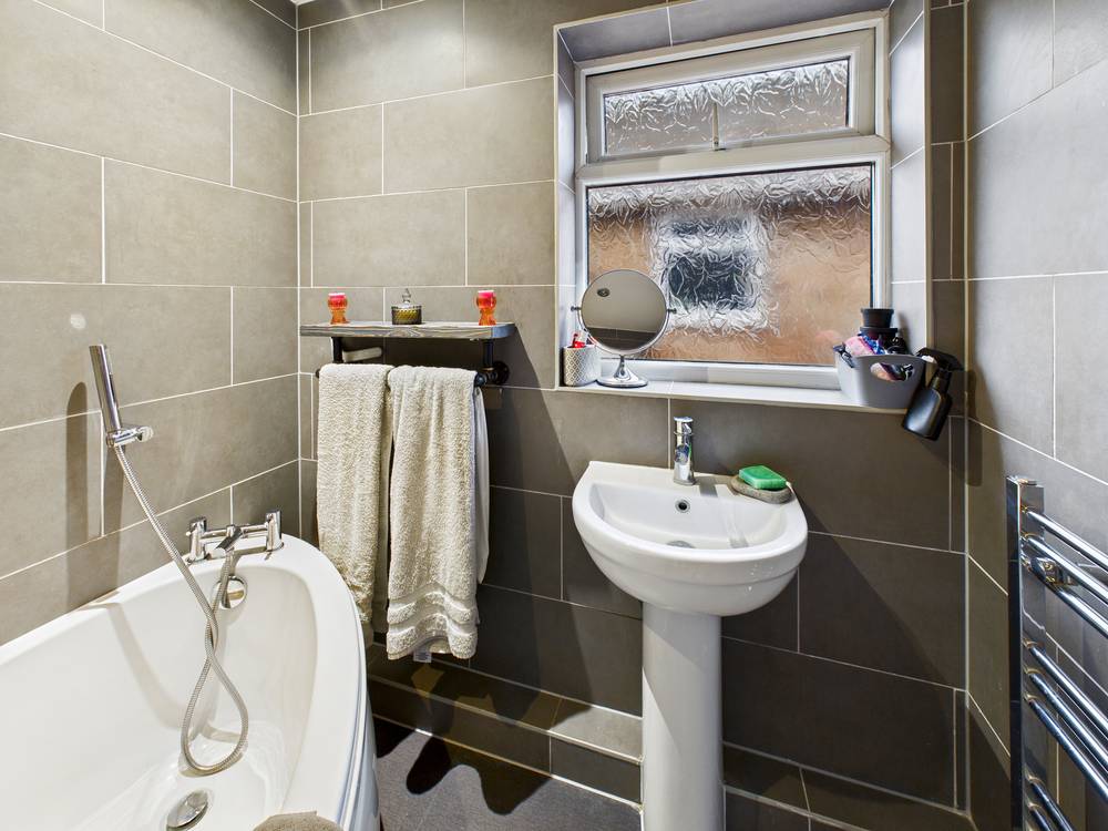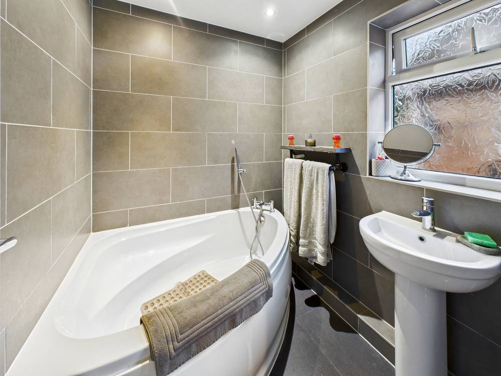 UPVC glazed window looking to the side of the property. Extractor fan. Stainless steel mixer tap over wash basin. Central heated towel radiator. Corner bath with stainless steel mixer tap and handheld shower.
