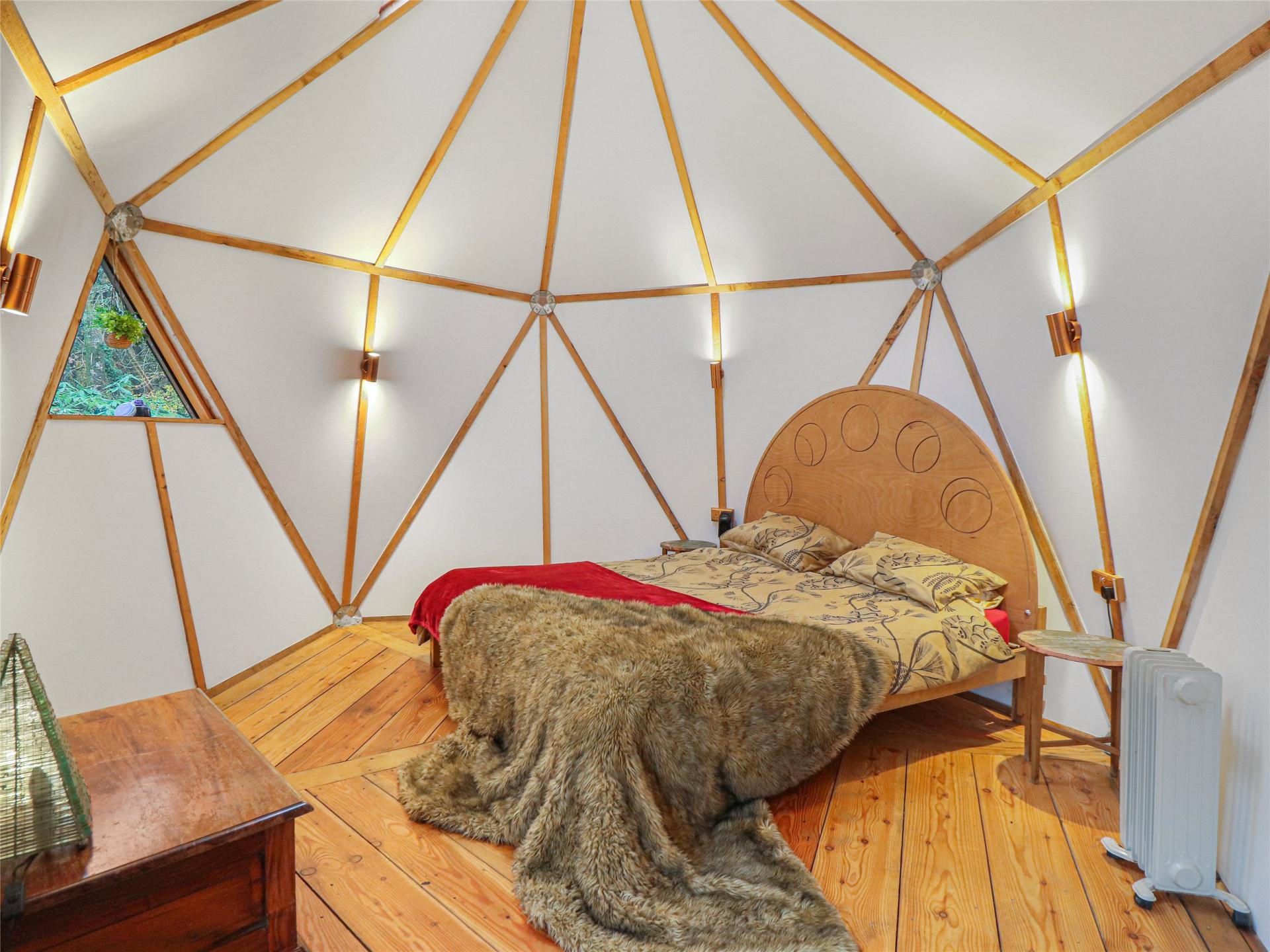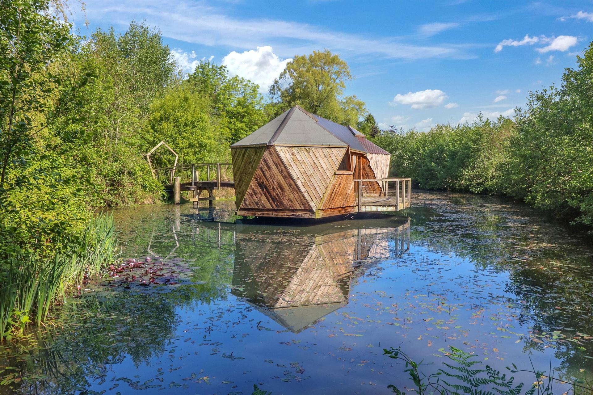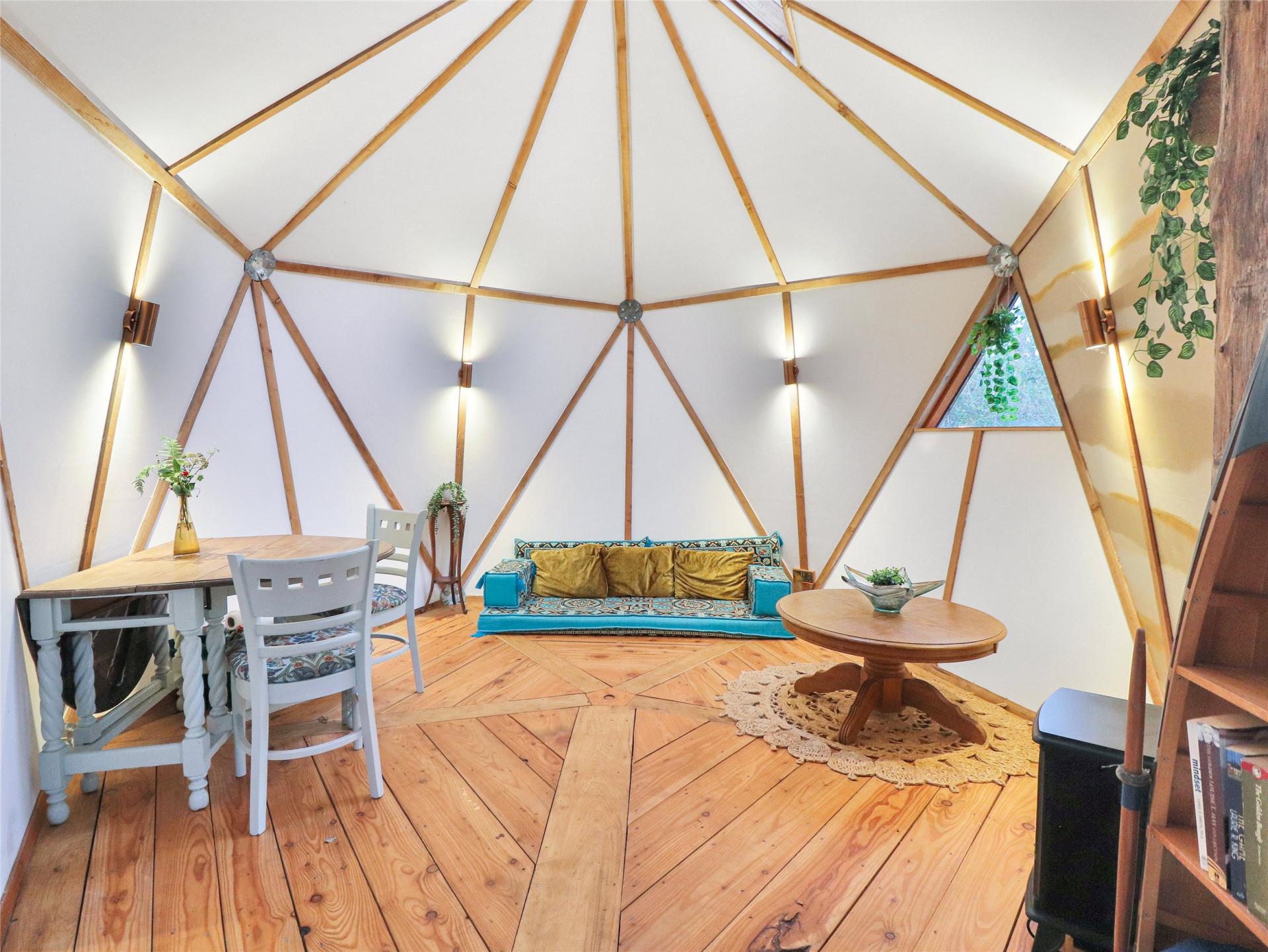 This is the most amazing geodome structure, with part copper tiled roof, that was subject to a TV programmes during its design and build. Approached across a wooden walk bridge Xanadu gives the appearance of hovering above the water and stepping inside this 40 space is quite an experience. Large bifold doors with decking outside overlook the water whilst the open plan space with hexagonal ends gives a feeling of light and airiness, having a sink midway, with bespoke copper pipe taps above protruding from a wavy birch panel. Leading off is a cloakroom WC.