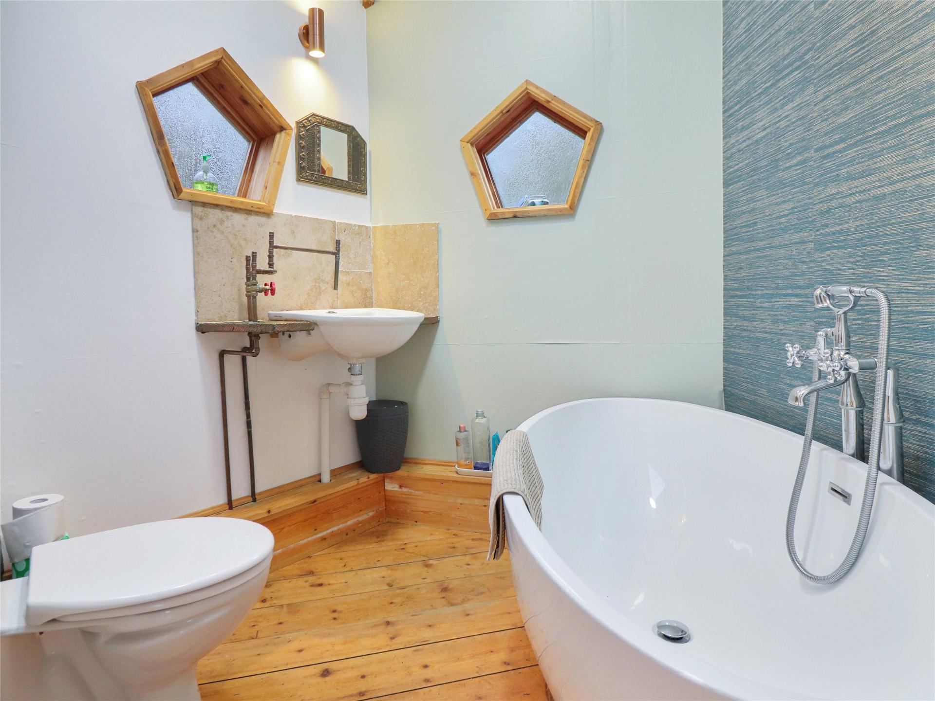 A glazed boot room provides ample room for outdoor gear and a door leads into a 22 split level reception hall. The sitting room is a cosy space having a large granite fireplace with period character log burner inset. Doors open into both the study/office and courtyard. The double aspect study/office is currently used as a ground floor bedroom and within is a fitted bookcase and office desk. At the other end of the reception hall is found a delightful double aspect beamed breakfast room complete with tiled floor, impressive fireplace with tiled surround and an oil fired twin oven Rayburn sitting on a raised hearth. Of more recent times the kitchen has been refitted with an extensive range of wall, floor and drawer units with marble work surfaces running around three sides, a twin glazed sink, tiled floor and appliance space for dish washer, larger fridge/freezer and range cooker. Leading off the breakfast room is another reception room that would be ideal for a childrens playroom or even a fifth bedroom. A lean to garden room runs outside the breakfast room and kitchen and being some 33 in length, is an ideal space for storing items required for the glamp site and annex accommodation. Leading off is the utility/boiler room which house the oil fired boiler for hot water and heating and has space for both washing machine and tumble dryer. A shower room and twin WC are found adjacent being available for use by visitors staying on site as there is a door leading to the grounds outside. Rounding off the ground floor accommodation is the refitted bathroom offering a white four piece suite with shower over bath, tiled walls and chequerboard tiled floor.