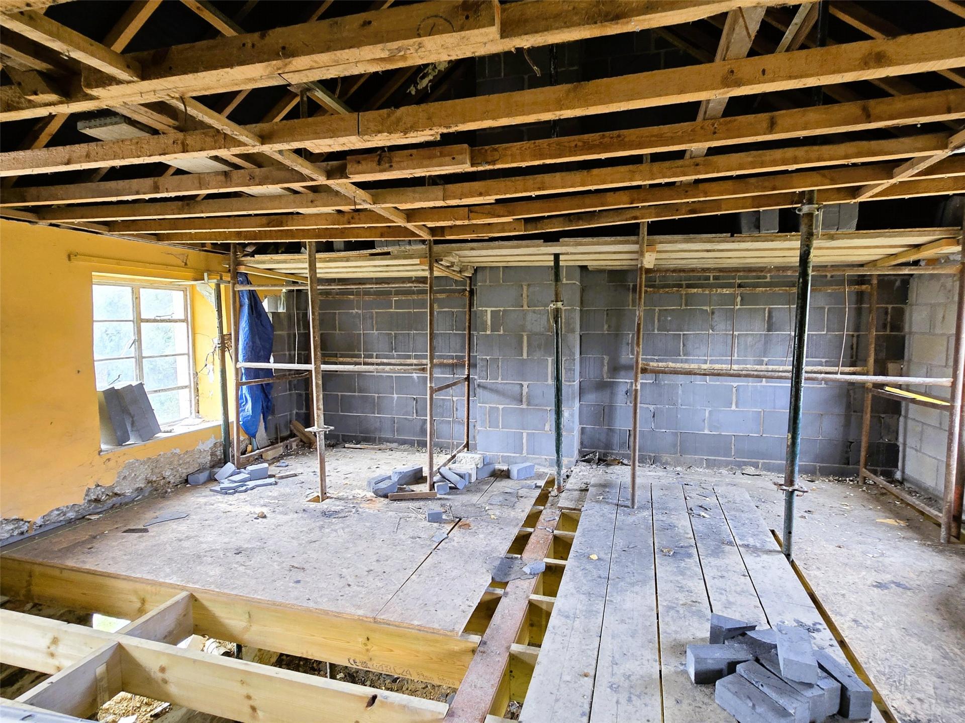 The house if very much in an unfinished state although the principal walls are in situ allowing for the redesign passed at planning and the intended layout can be seen. The ceiling joists are in and the first floor is very much work in progress with no formal stairs leading to it and little in the way of flooring. The roof timbers are exposed and there is further work to be undertaken to make the roof watertight. The good news is, as agents, we are advised the materials for this are already on site.