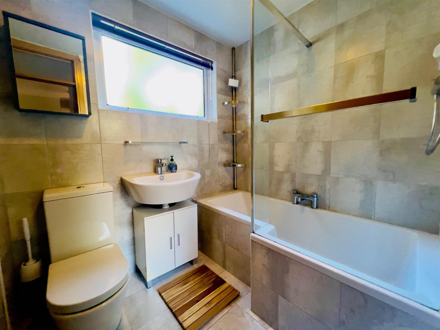 Bathroom / Wc - Opaque double glazed window to side, L-shaped tiled shower bath with mixer tap, shower flexi hose with glass shower screen, wash hand basin with mixer tap and cupboard under, low level WC, heated towel rail, fully tiled walls, tiled flooring.