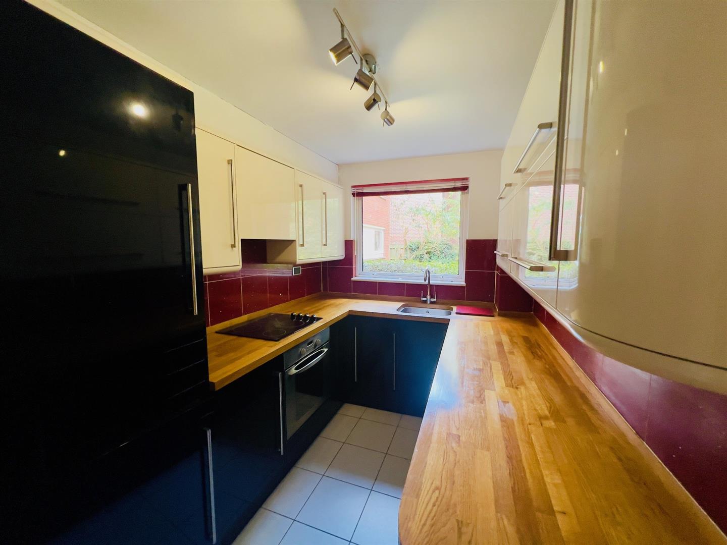 Kitchen - 3.35m x 2.08m (11'0 x 6'10) - Double glazed window to side, comprising a range of wall and base units with wood block work surfacing over, single bowl sink with mixer tap inset in worktop, four ring electric hob with hood over, electric oven, washing machine, fridge freezer, part tiled walls, tiled floor.