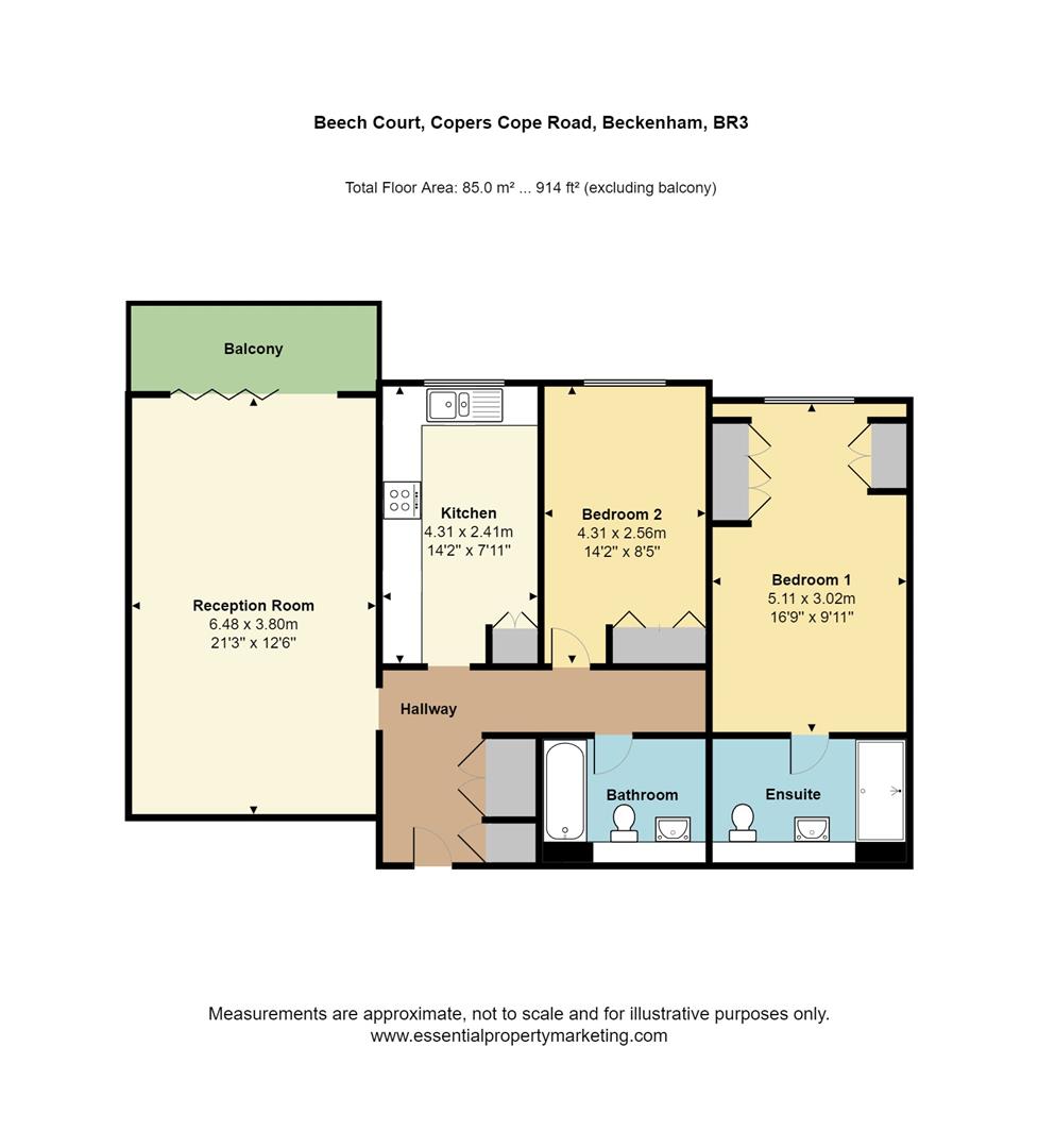 An excellently presented first floor balcony apartment with two double bedrooms, two bathrooms, 21' lounge/diner, well appointed kitchen. Passenger lift, garage, communal gardens. Convenient for railway stations, buses, trams and Beckenham Town Centre (approx half a mile). SHARED FREEHOLD