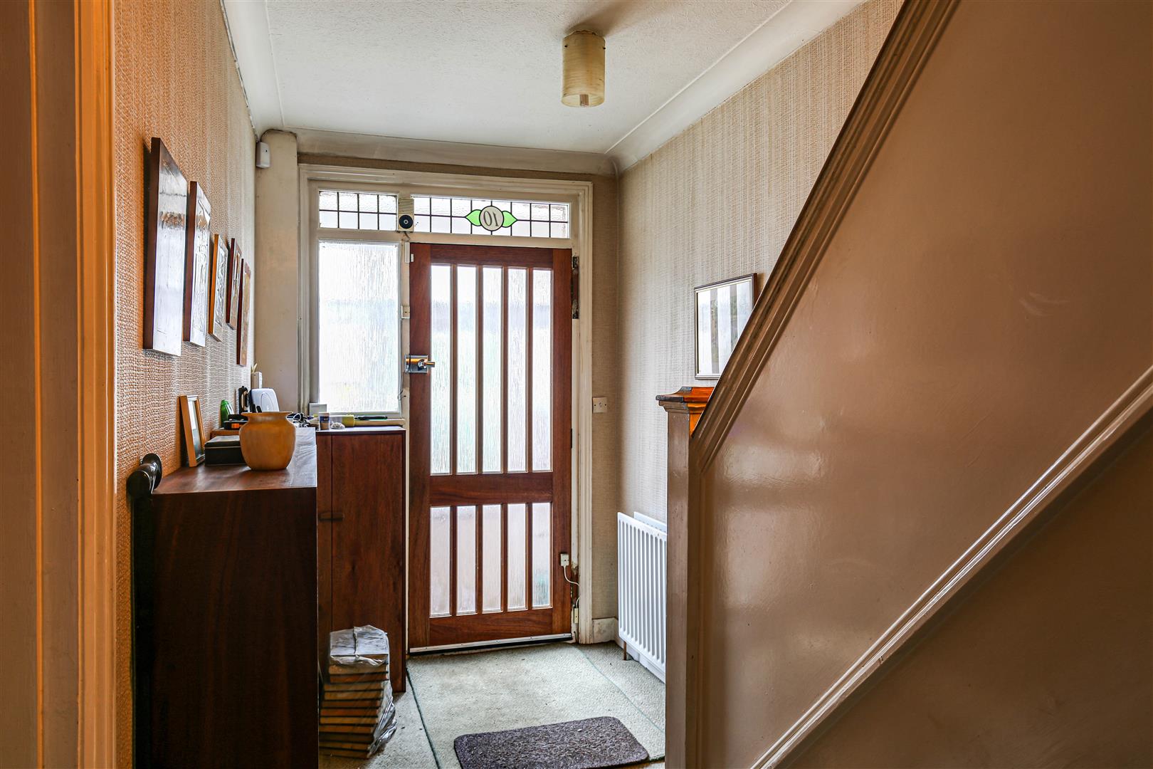 Entrance Hall - Understairs storage cupboards, radiator, fitted carpet.