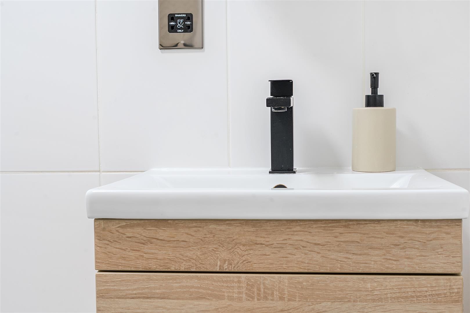 Bathroom/Wc - L-shaped panel bath with mixer tap and rain head shower over, shower screen, wall mounted vanity unit inset with sink, low level WC, towel rail, fully tiled walls, tiled flooring.