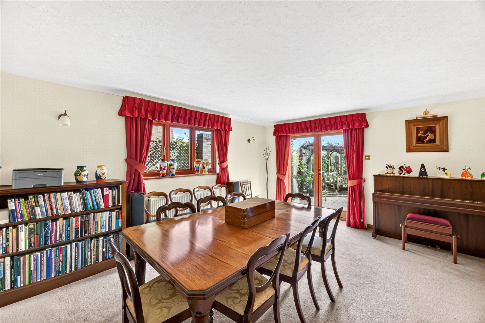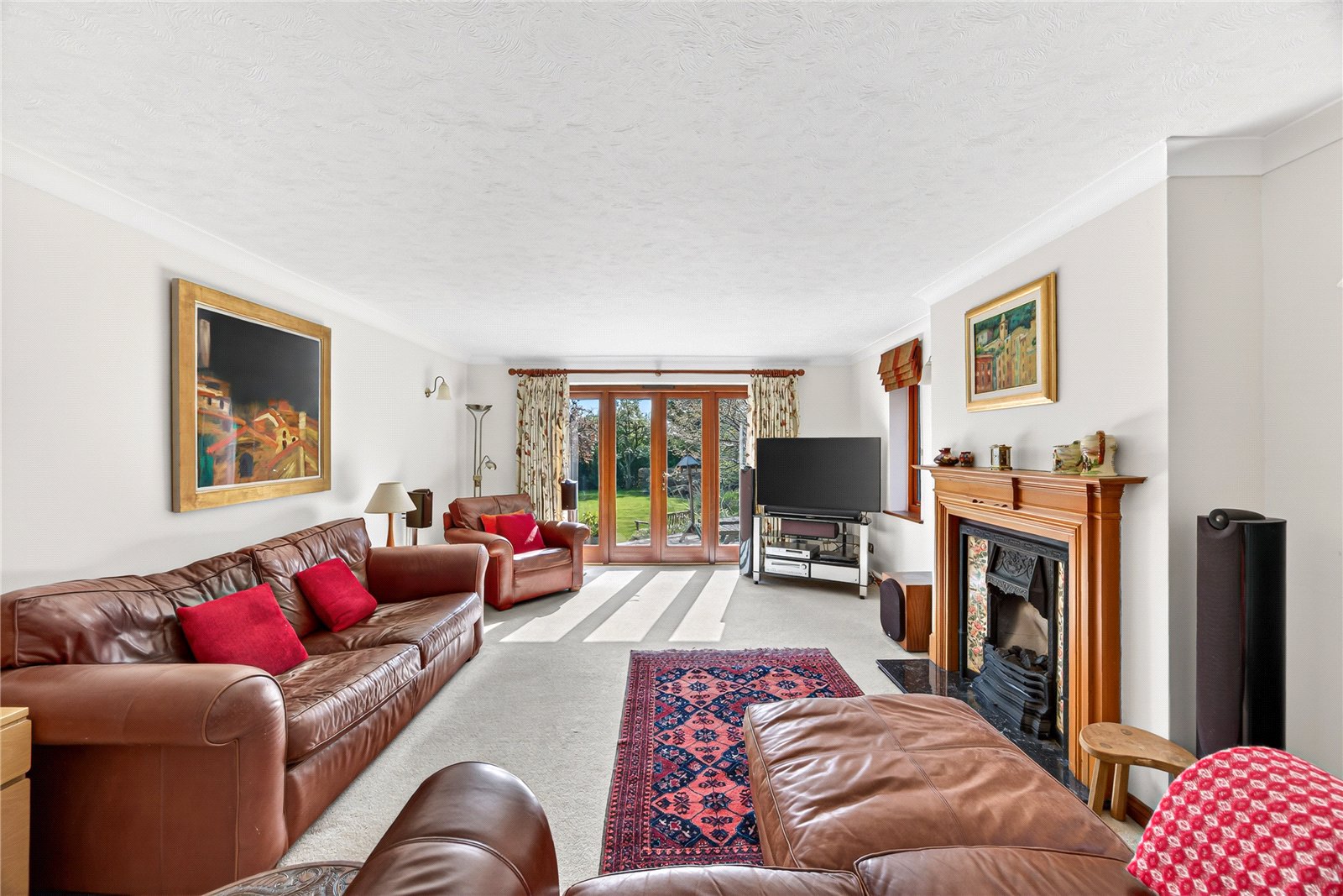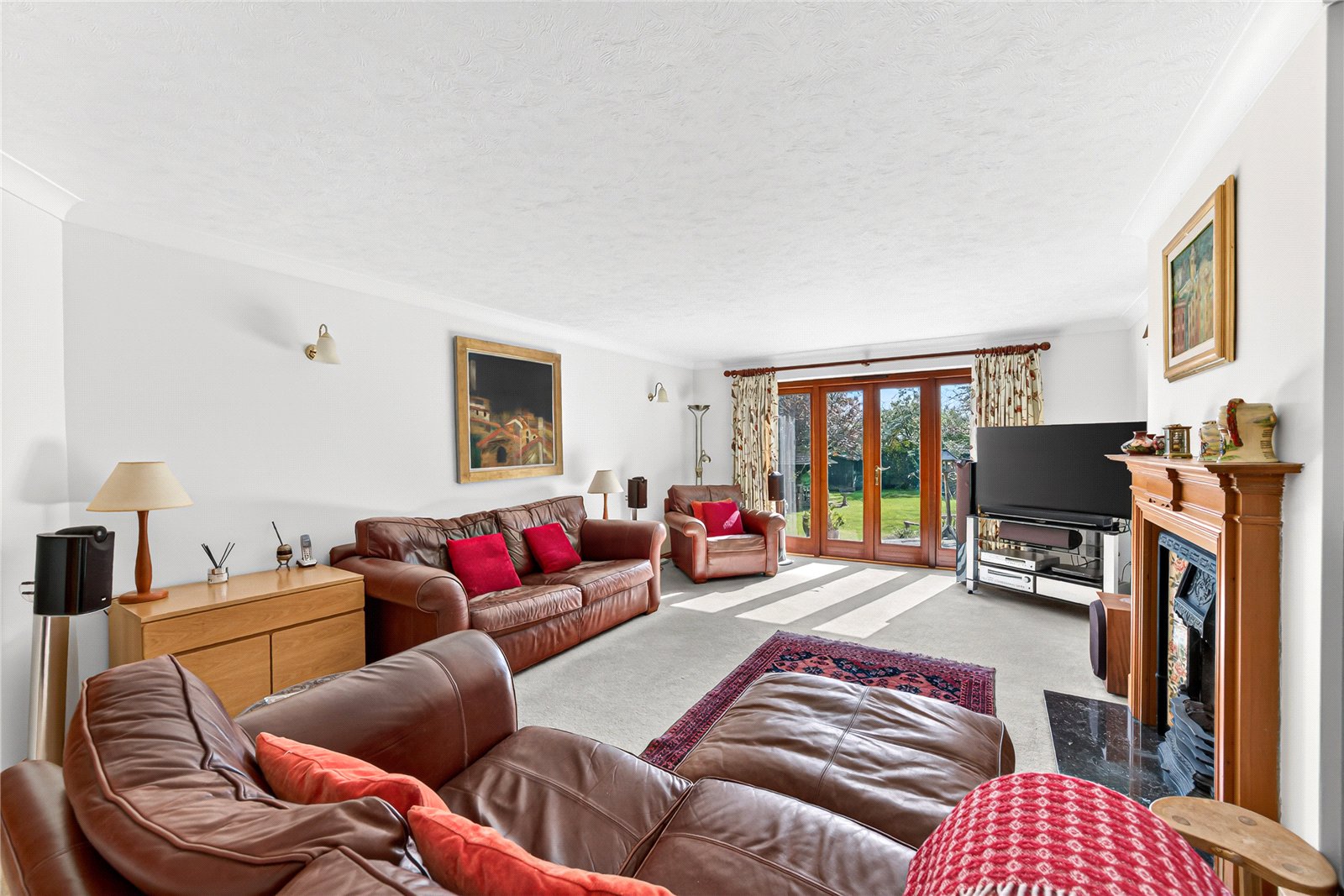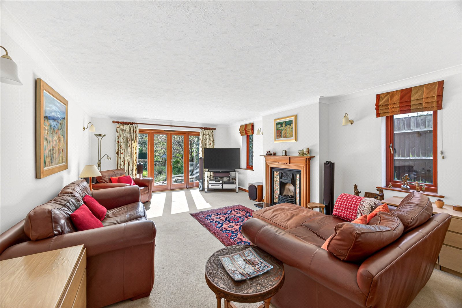- 21ft living room decorated in neutral tones & hues with French doors into the garden
